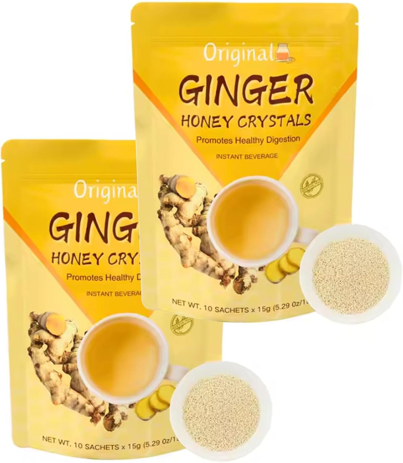 In einer Packung sind zwei Beutel der Instant-Honig-Ingwer-Getränkekristalle enthalten.