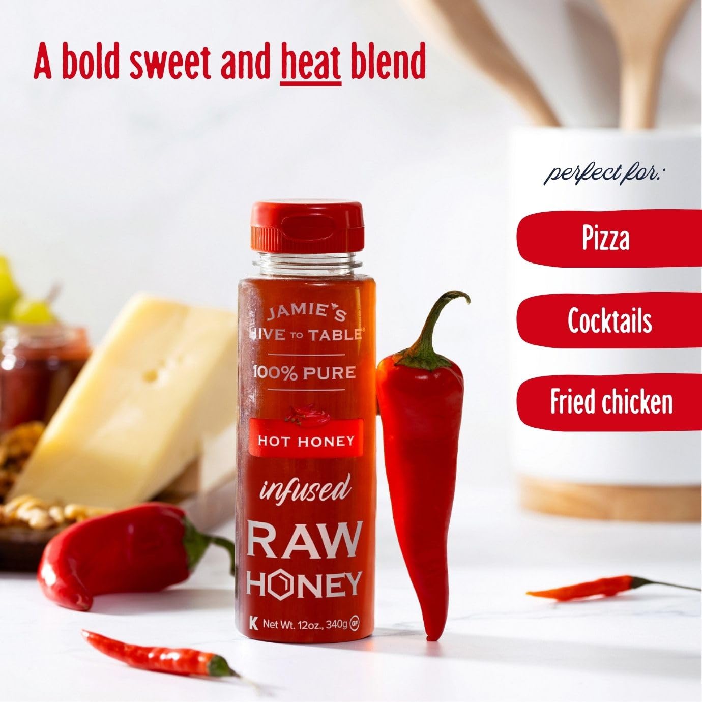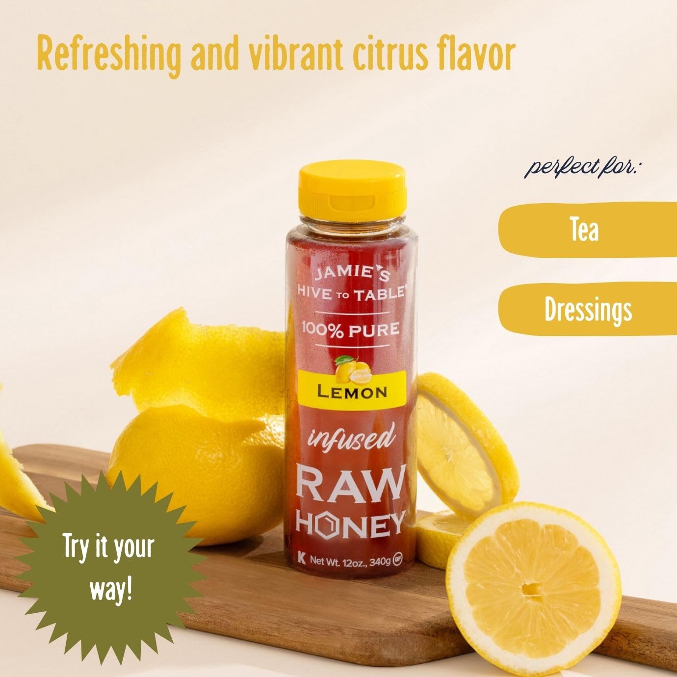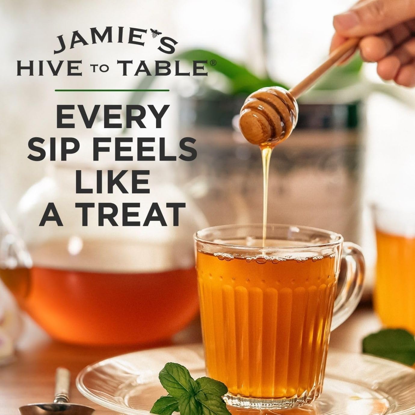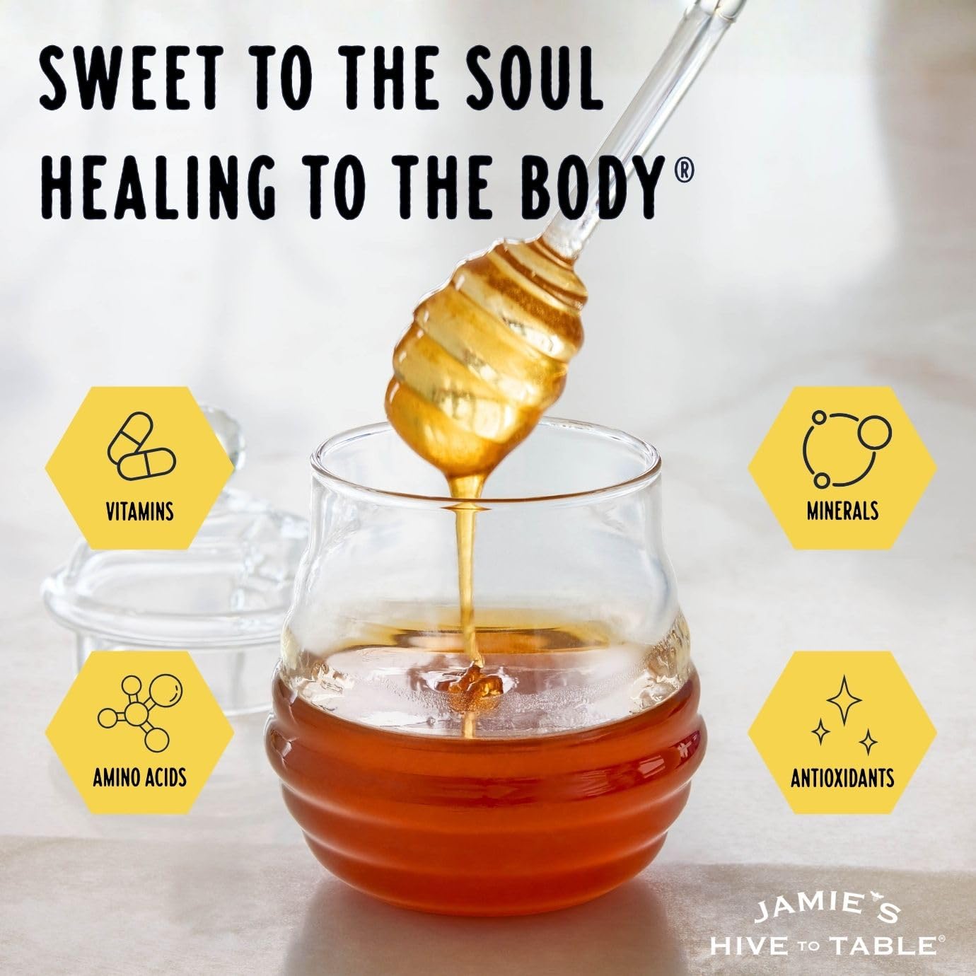 Genießen Sie den einzigartigen Geschmack von Jamie's Hive to Table Honig auf Joghurt, Müsli oder Eiscreme, in Cocktails oder auf Pfannkuchen und Waffeln.