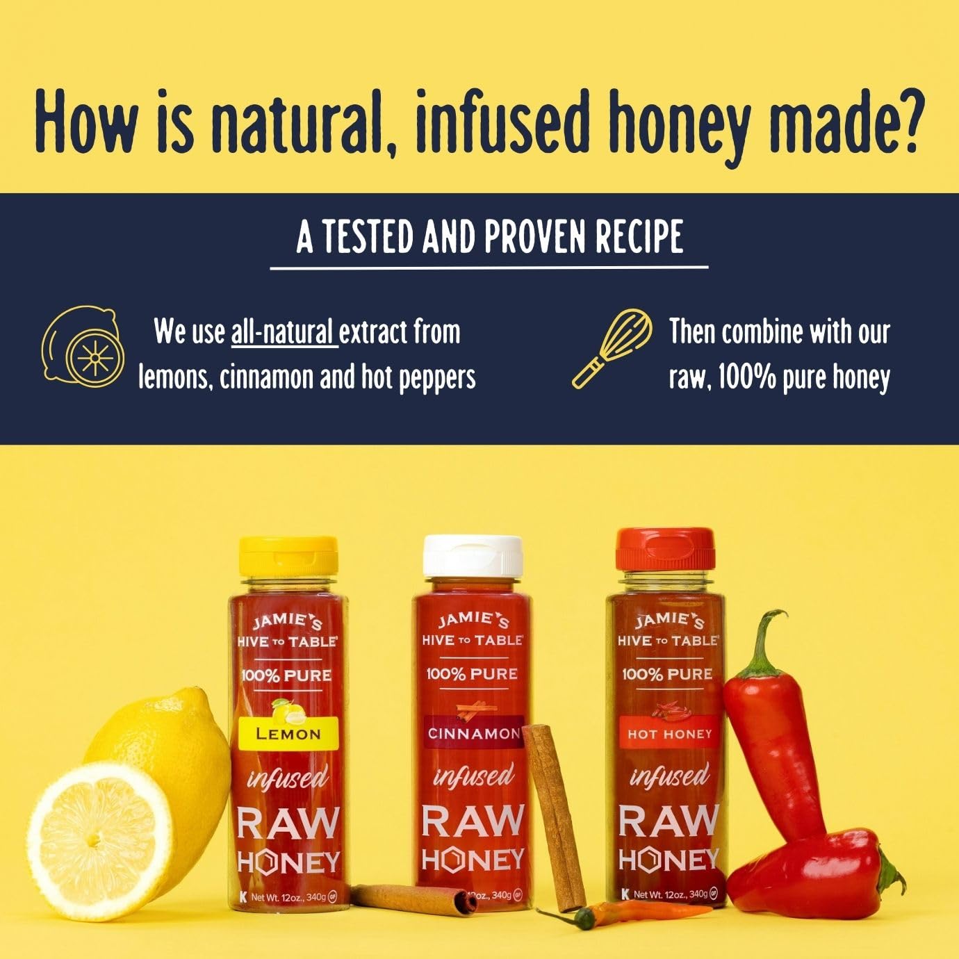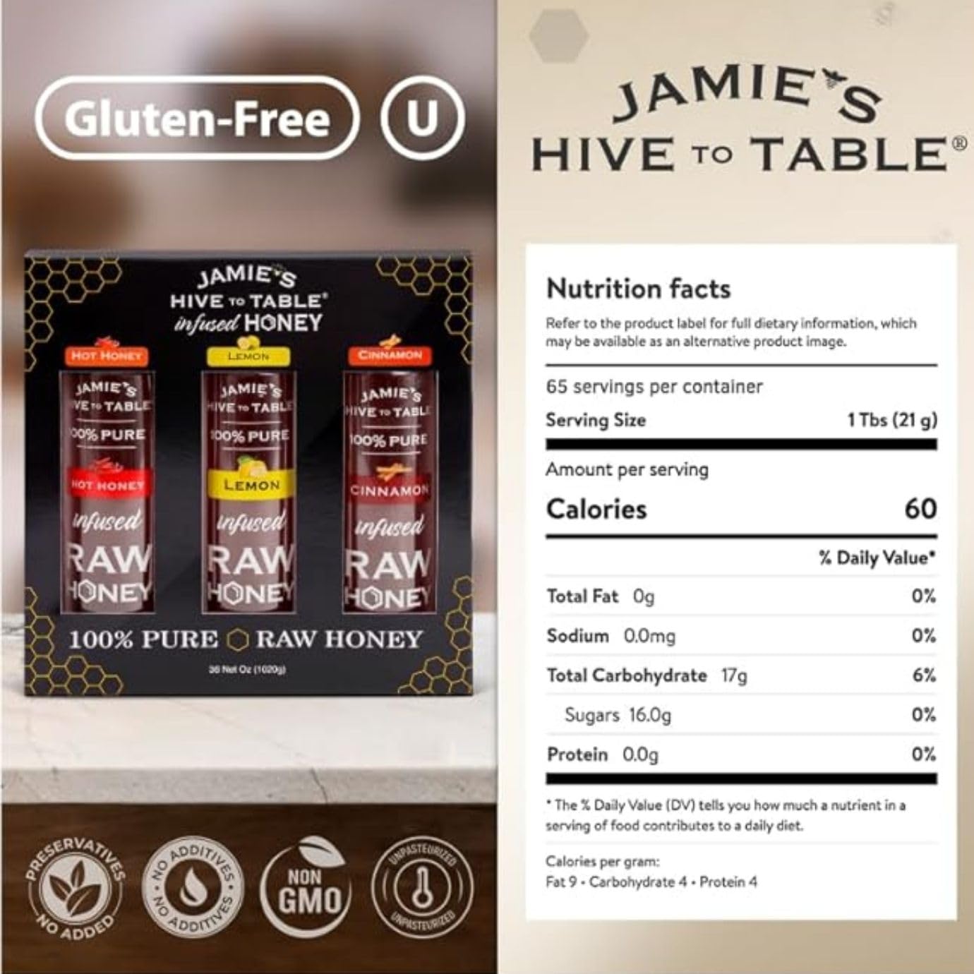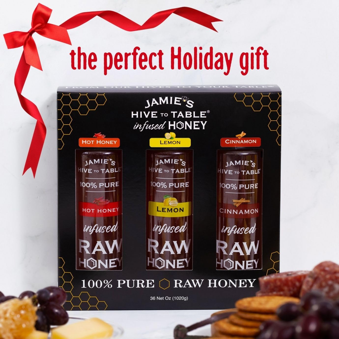 Jamie’s Hive to Table Infused Honey Gift Set – Hot Lemon and Cinnamon Flavors 1.020.6 g Squeeze Bottle – 100% Natural Raw Honey