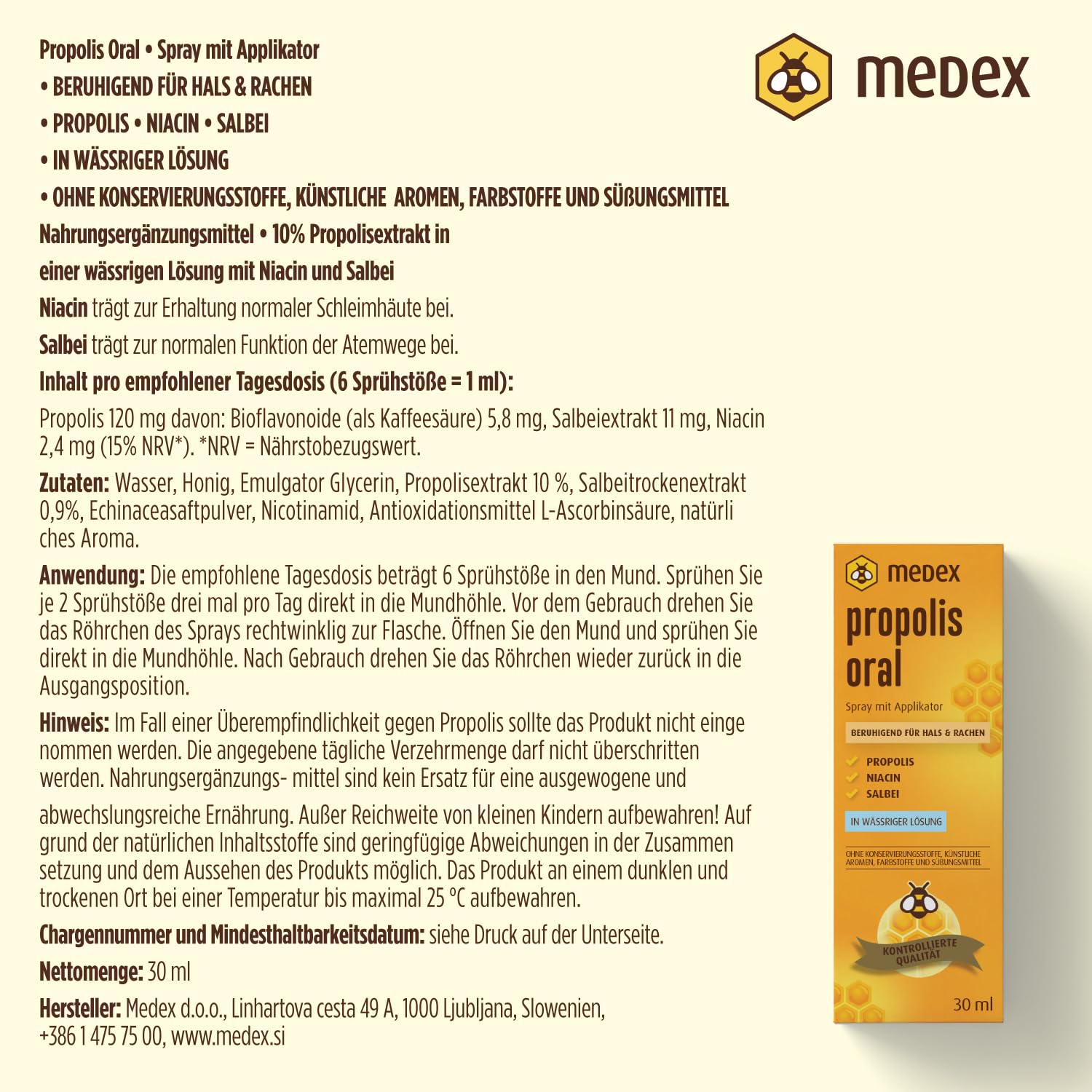Medex Propolis Oral, Mund- und Rachenspray, wasserbasiert, OHNE Alkohol; mit Honig, Salbei, Niacin, Echinacea, Standardisierte Menge an Bioflavonoiden, mit Applikator, 30 ml