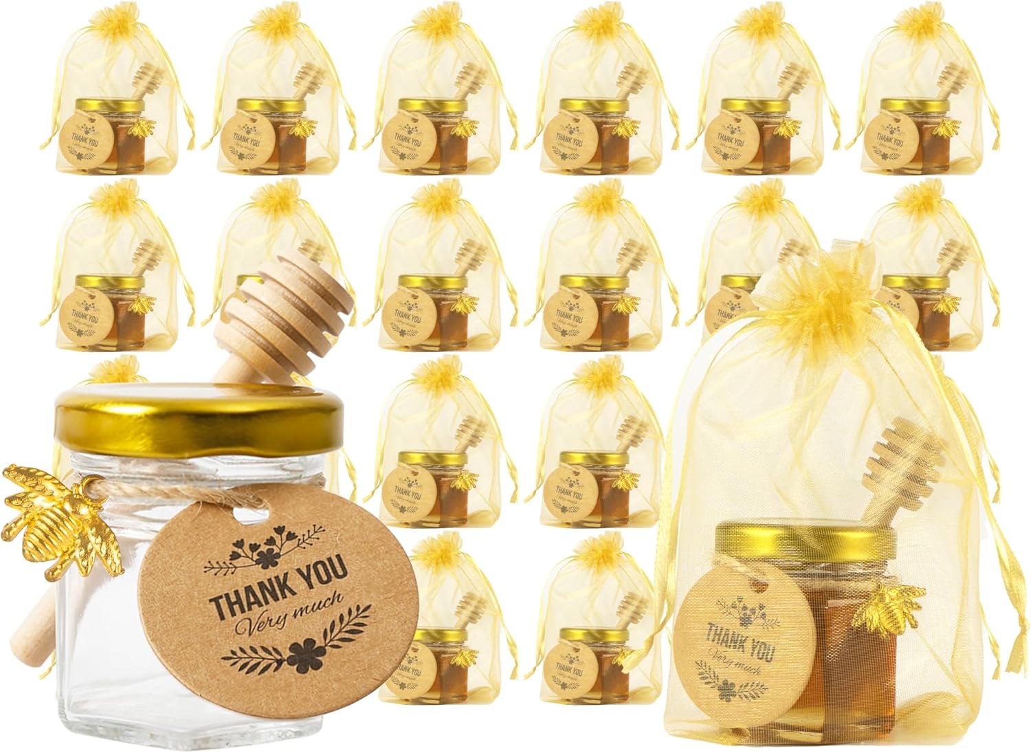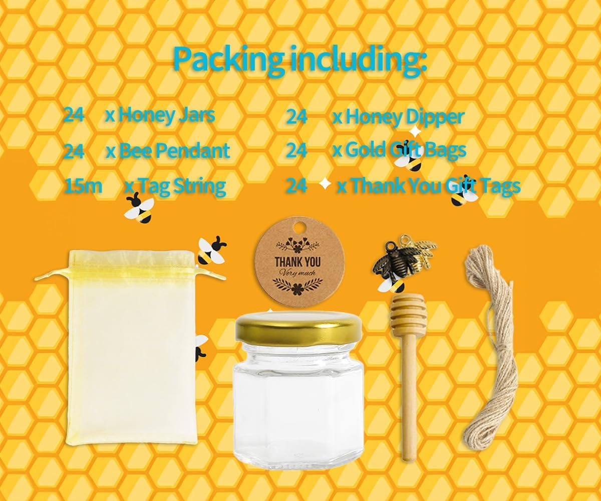 The set includes 24 mini glass hexagon jars, gold lids, bee charms pendants, honey dipper sticks, gold gift bags, thank you gift tags, and jute tag string.