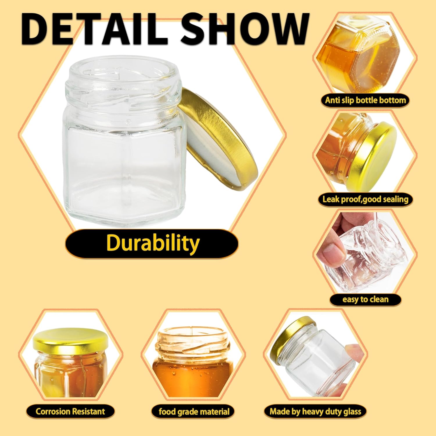 1.5oz Mini Glass Hexagon Canning Jars with Gold Lid, Bee Charms Honeybee Pendant, Honey Dipper Sticks, Jute Tag String, Square kraft paper