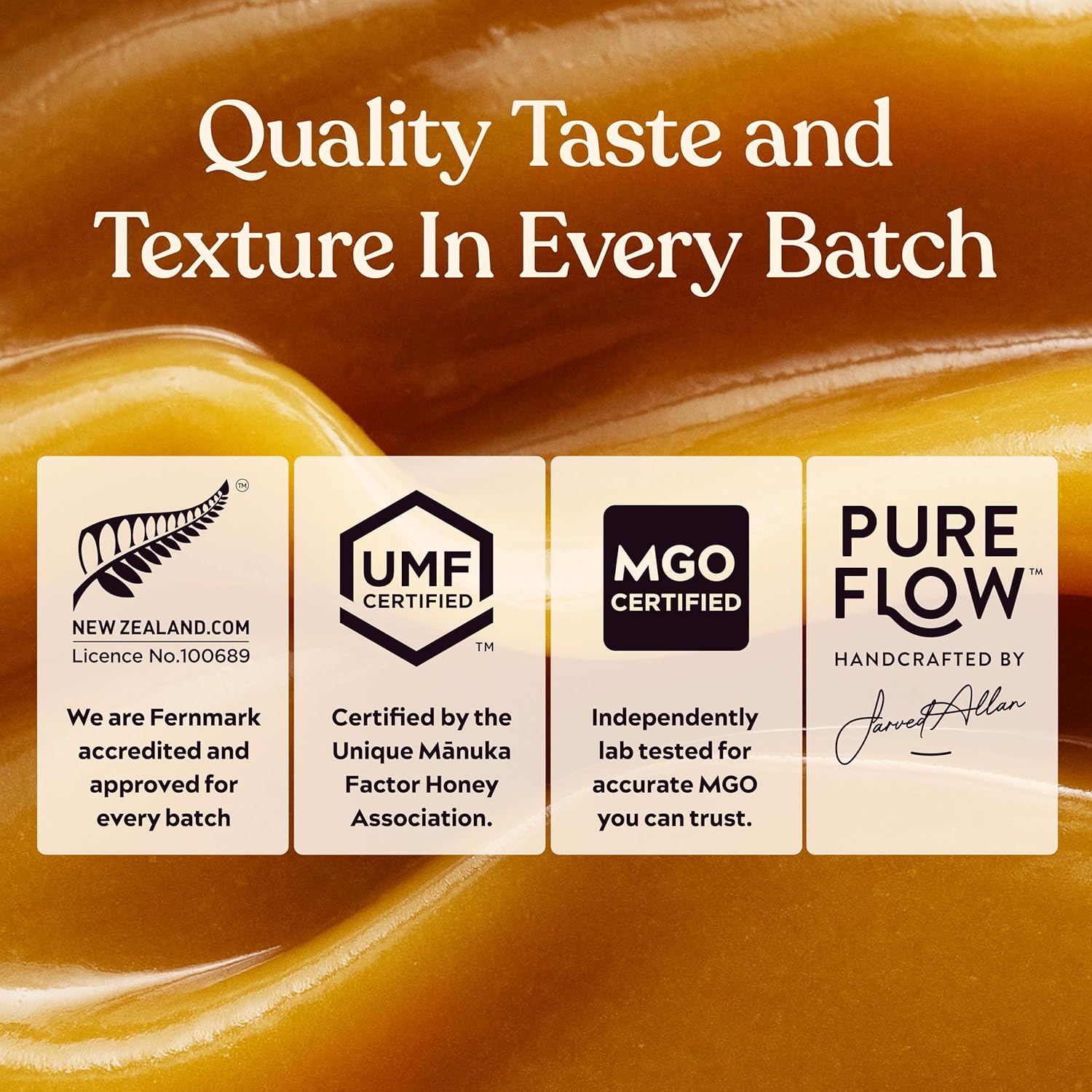 AWARD WINNING TASTE & SMOOTHNESS: 100% Pure New Zealand Honey holds the esteemed Supreme Honey Award for 2021, 2022, 2023 at New Zealand’s national honey awards. Our proprietary Pure Flow creaming process ensures our honey is creamed to be exceptionally smooth and celebrates the delicious rich caramel tastes of premium MGO Mānuka Honey, while locking in the nutrients.