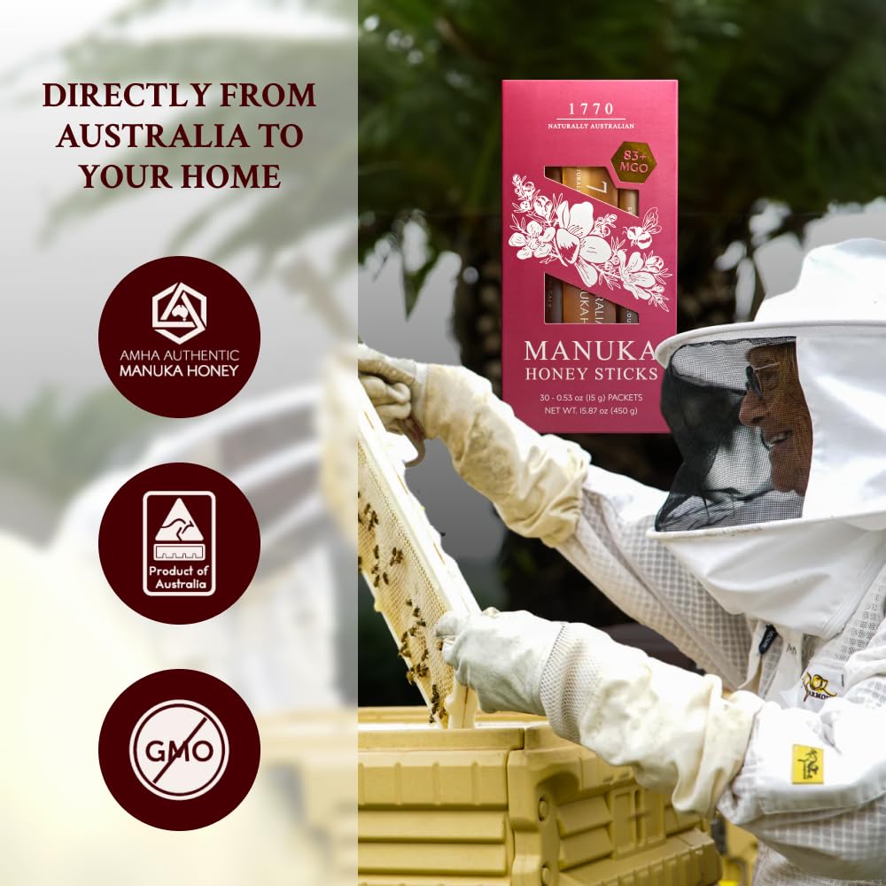 AUTHENTIC AUSTRALIAN MANUKA HONEY: Made from the nectar of Australian Leptospermum plants, our MGO 83+ Manuka honey offers a floral taste and bright golden color from Australian beekeepers who harvest sustainably. No additives, fillers, or dilution — just raw, authentic Manuka honey in its most natural form.