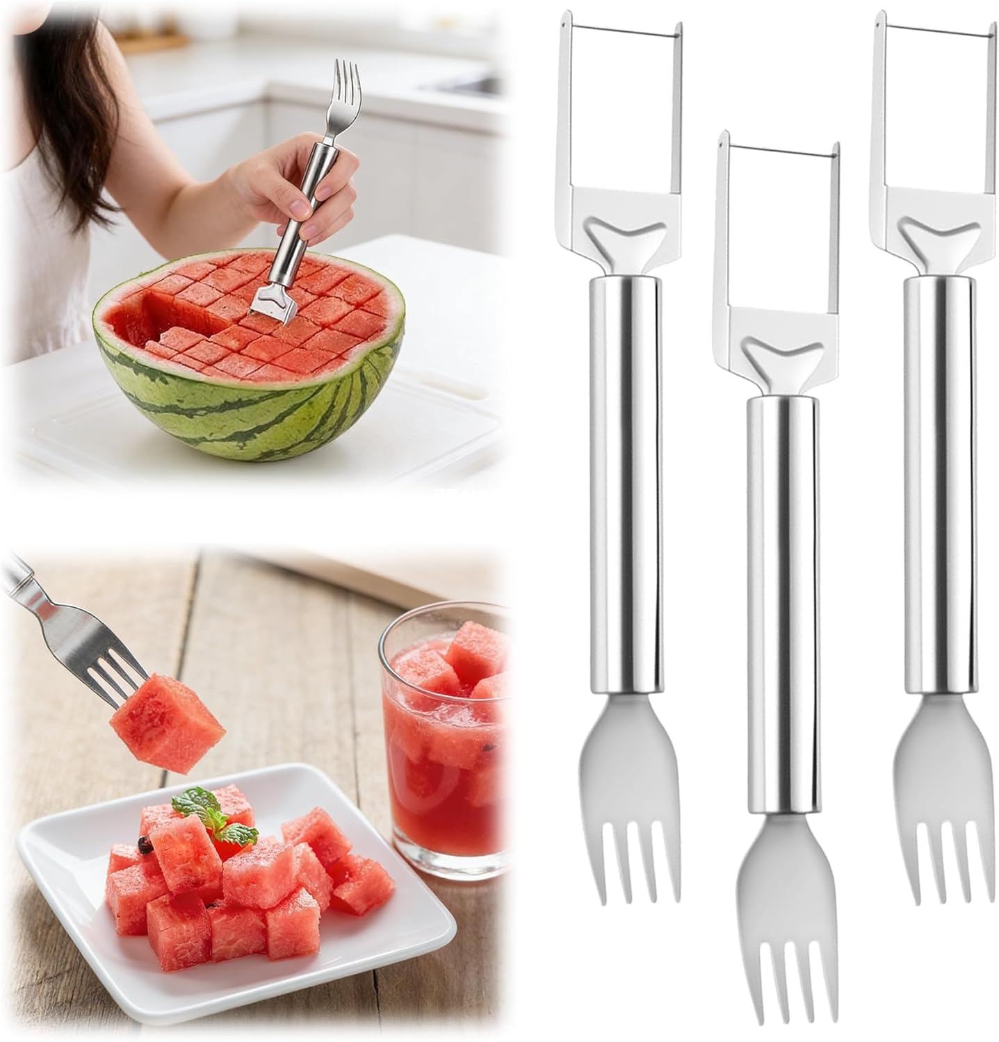 【2-in-1 Watermelon Slicer】Sharp slicer and sturdy fork in one. Cuts watermelon into perfect cubes—no mess, no extra tools.