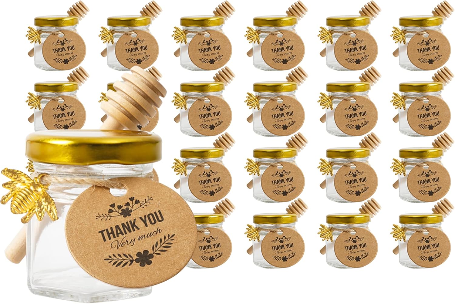 ☀️ 24pcs 1.5oz Hexagon mini mason honey jars with Lids, 24pcs Honey stick, 24pcs Bee Charms Honeybee Pendant,Tag String,Thank You Gift Tags.