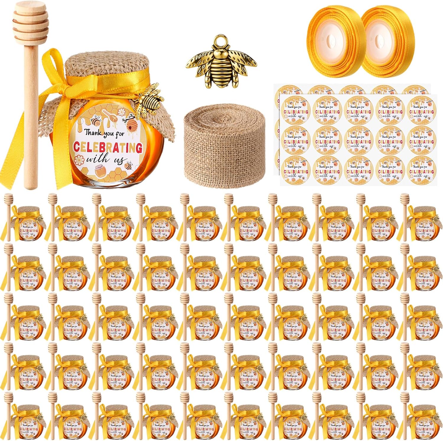 Package Included: you will get 30 glass honey jars and wooden dippers, 30 gold lids, 30 round honey themed stickers, 1 roll of 5 meters of primary color jute webbing, 1 roll of 10 meters of gold polyester ribbon, and 30 bee pendants, so you can easily hold your honey; Elegant shapes enhance table settings, dessert bars, or craft displays, and the styles and quantities meet a wide range of applications; Note: linen and stickers are self adhesive