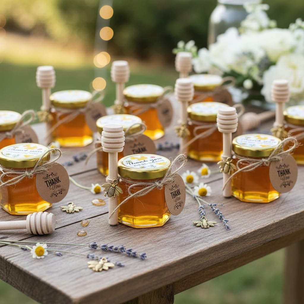 Adorable Design: Each jar comes with a cute bee pendant and a honey dipper, adding a touch of charm to your baby shower or wedding favors. The included stickers can be used to personalize the lids, making them extra special