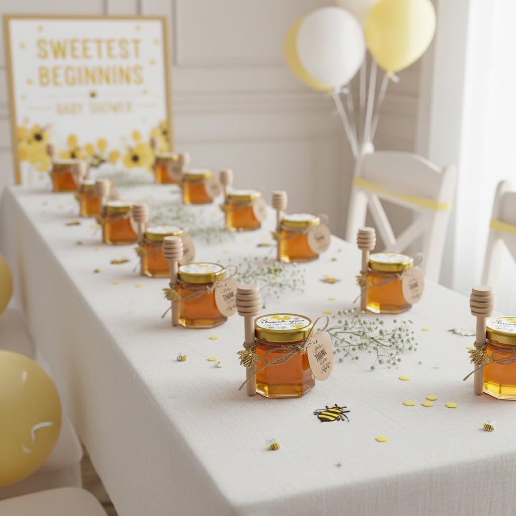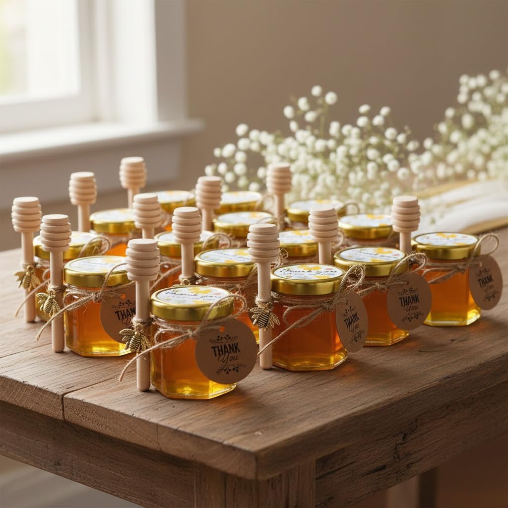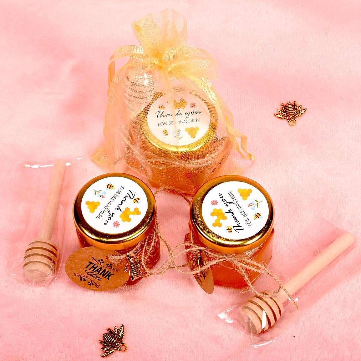 Adorable Design: Each jar comes with a cute bee pendant and a honey dipper, adding a touch of charm to your baby shower or wedding favors. The included stickers can be used to personalize the lids, making them extra special