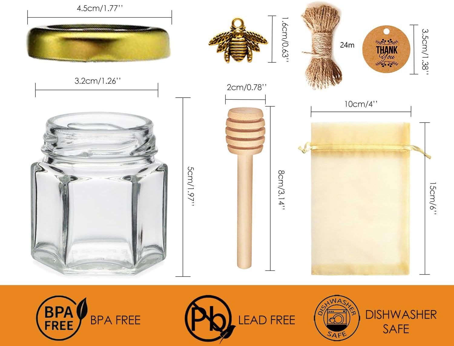 What You Will Get – Our 1.5oz glass honey pot is come with Bee-Themed Accessories, including 40 pcs glass honey jars and wood dippers, 40 pcs gold lids, 24m jutes, 40 pcs bee charms, 40 pcs gold gift bags and 40 pcs thank-you tags