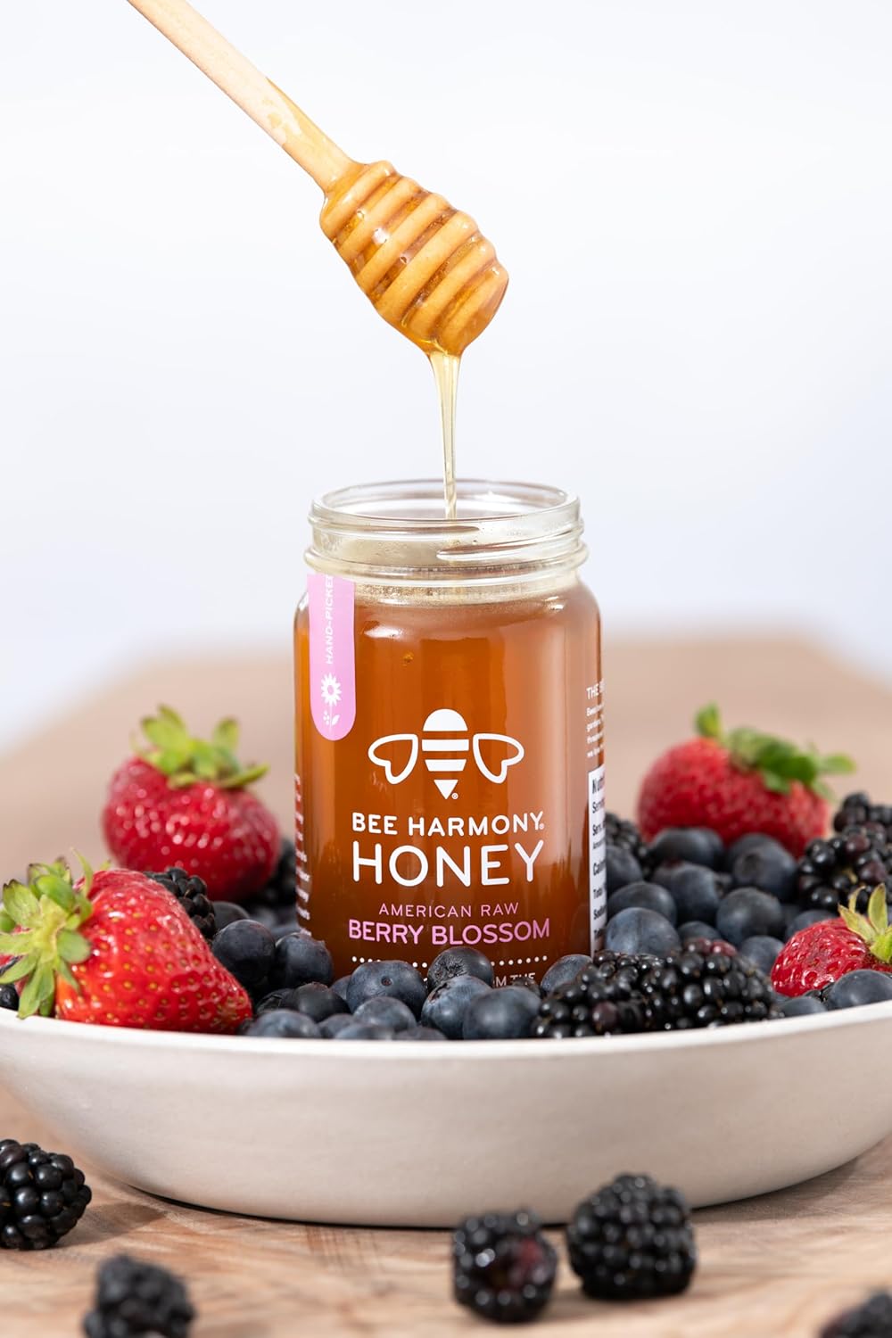 Bee Harmony Raw Honey with natural pollen and enzymes. Contains 5 jars, 12 ounces each. One of each variety: Clover, Wildflower, Orange Blossom, Berry and Blueberry Honey. (Total of 60 ounces of raw honey).