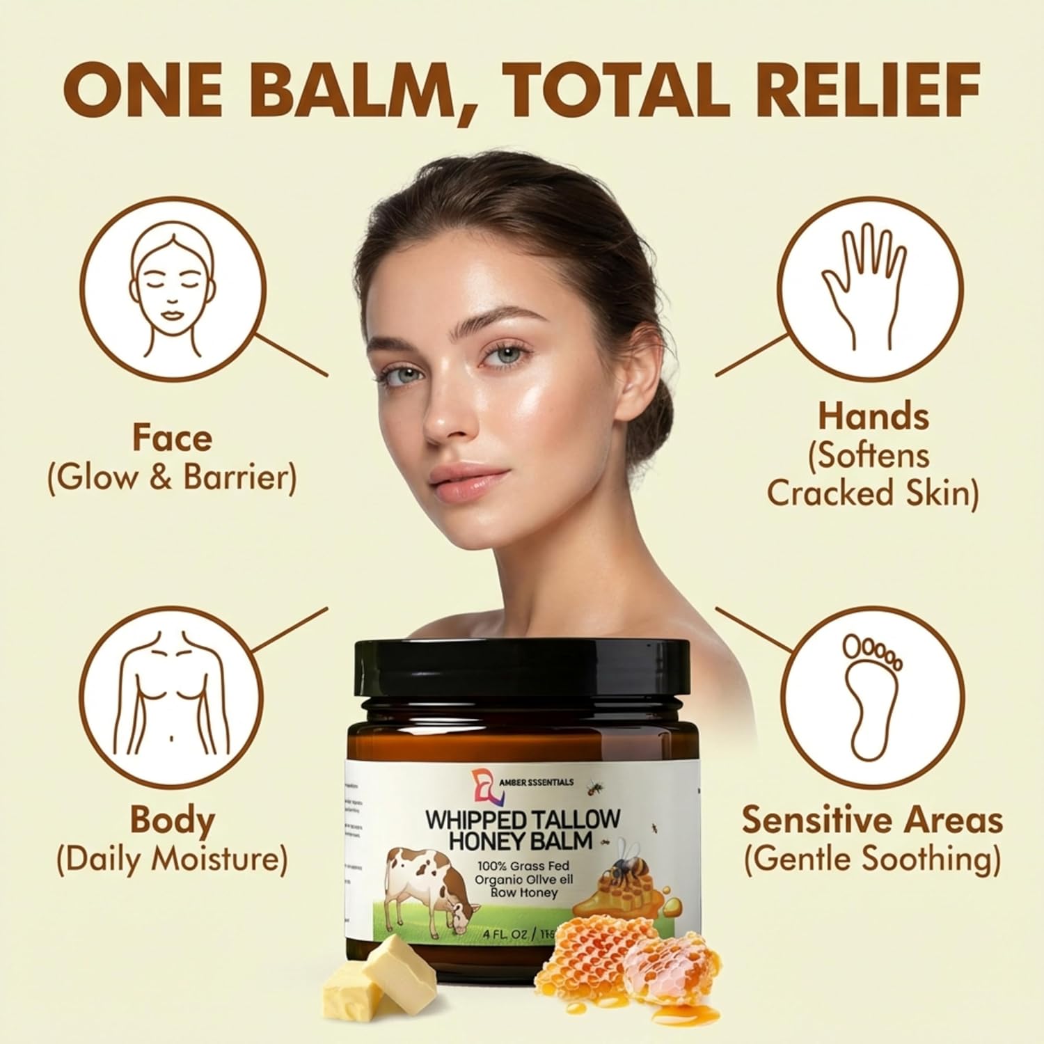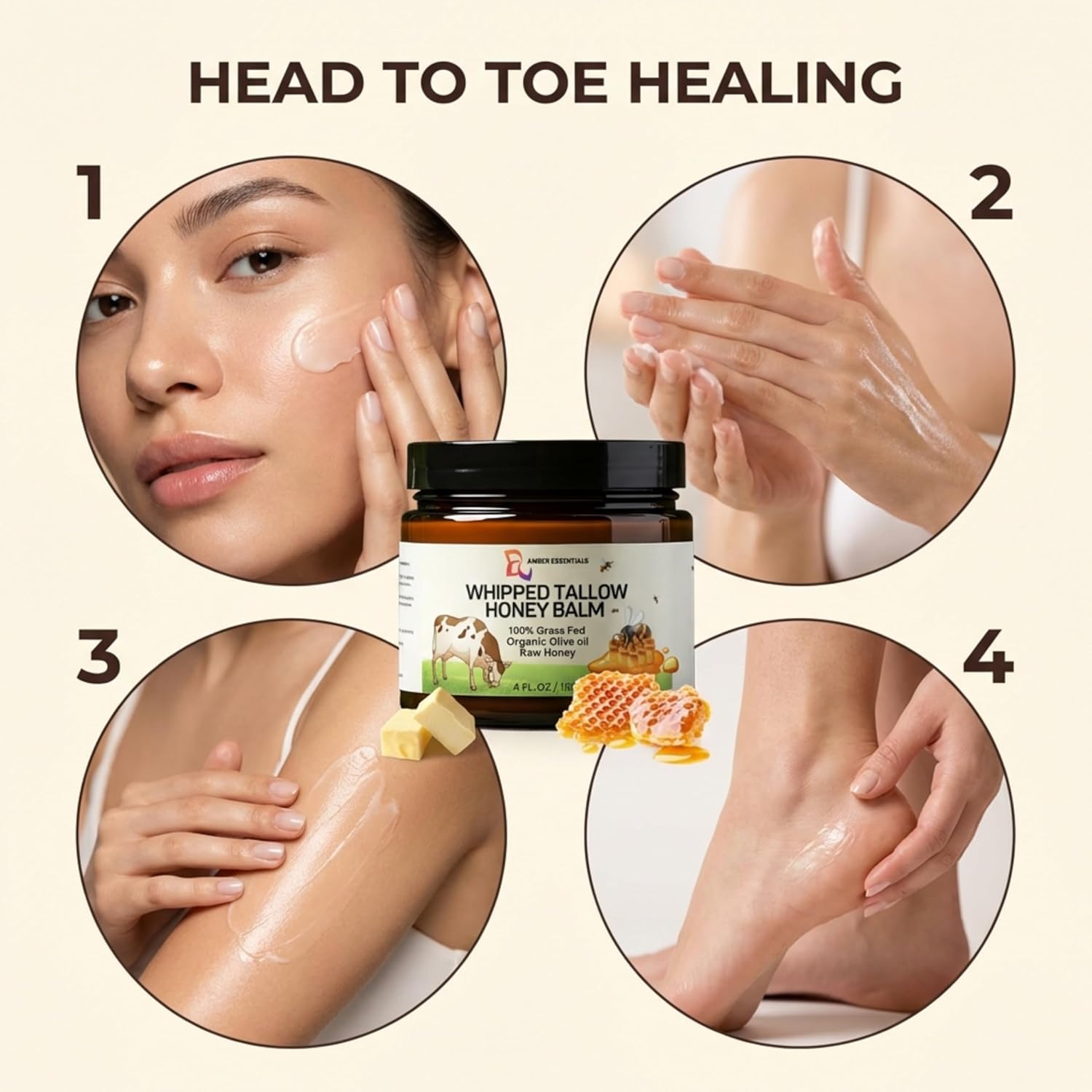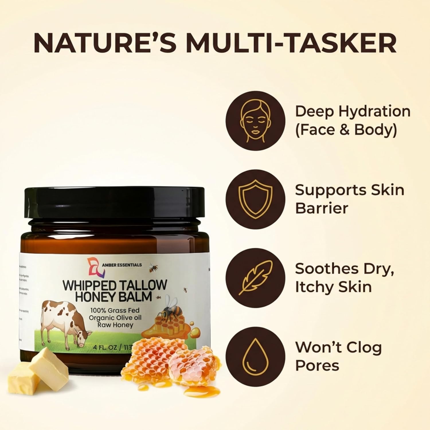 Beef Tallow & Honey Balm, All-Natural Moisturizer with Raw Honey & Olive Oil, Grass-Fed Tallow Cream for Face & Body, Deeply Nourishing Skin Care for Women & Men, Rich Moisture