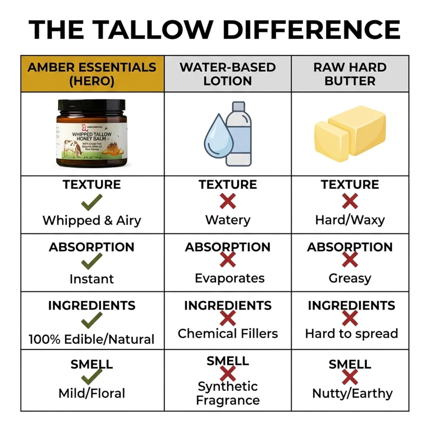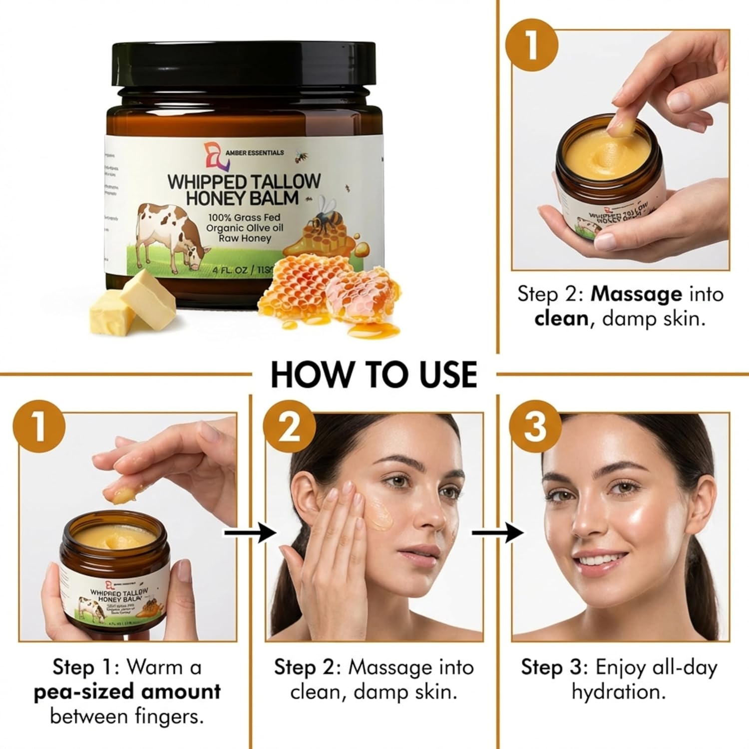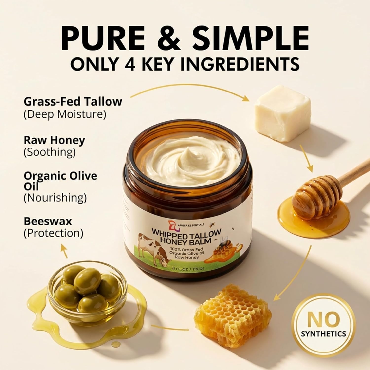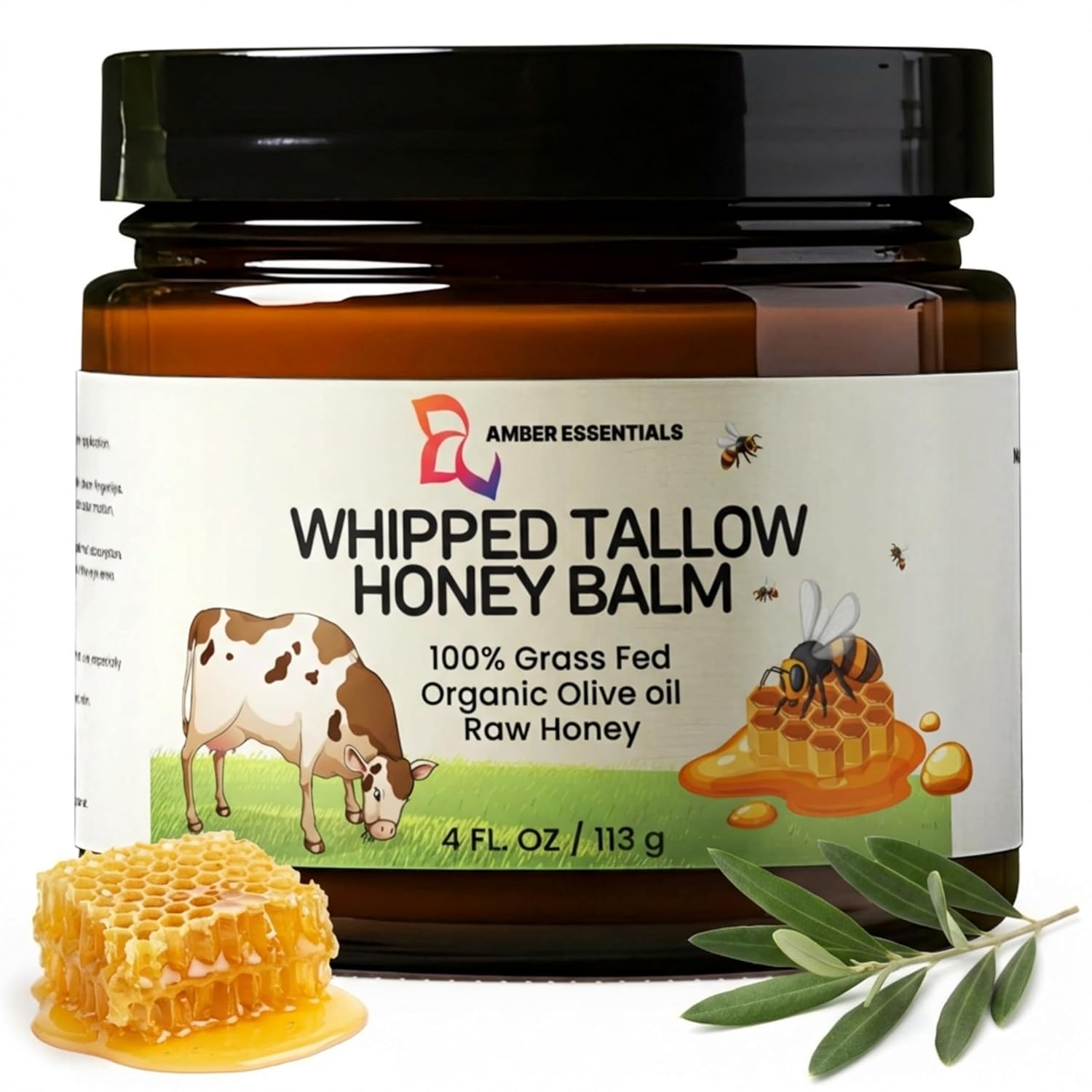The main ingredients include beef tallow, raw honey, and olive oil.