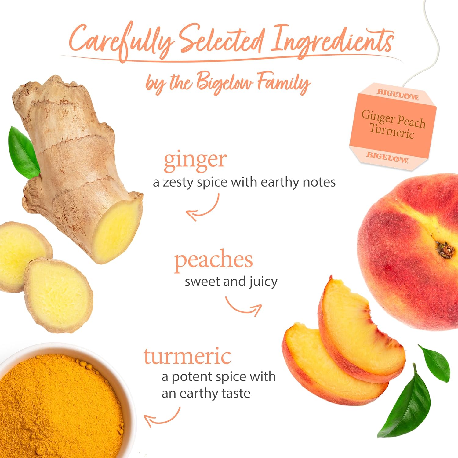 Ginger Peach Turmeric: 108 tea bags of Bigelow Ginger Peach Turmeric Herbal Tea, an aromatic blend of ginger, peach and turmeric giving this tea a zesty spicy twist that invigorates the senses