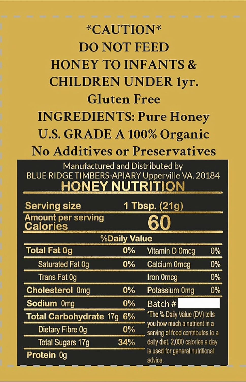 REGIONAL QUALITY: Sourced and produced in the BLUE RIDGE TIMBERS very own Apiary in Upperville, VA, featuring honey with an Optimal Fructose/Glucose ratio for a very enhanced sweetness and consistency.