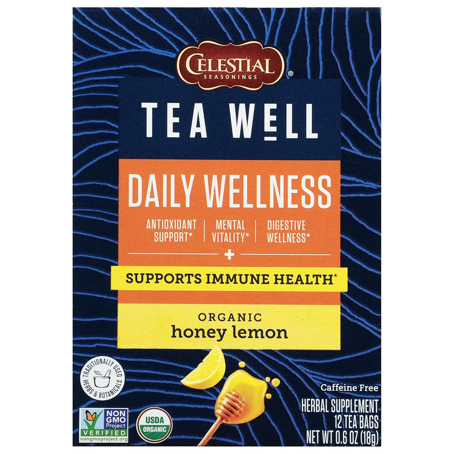 Each box contains 12 individually wrapped tea bags of TeaWell Organic Honey Lemon Wellness Tea