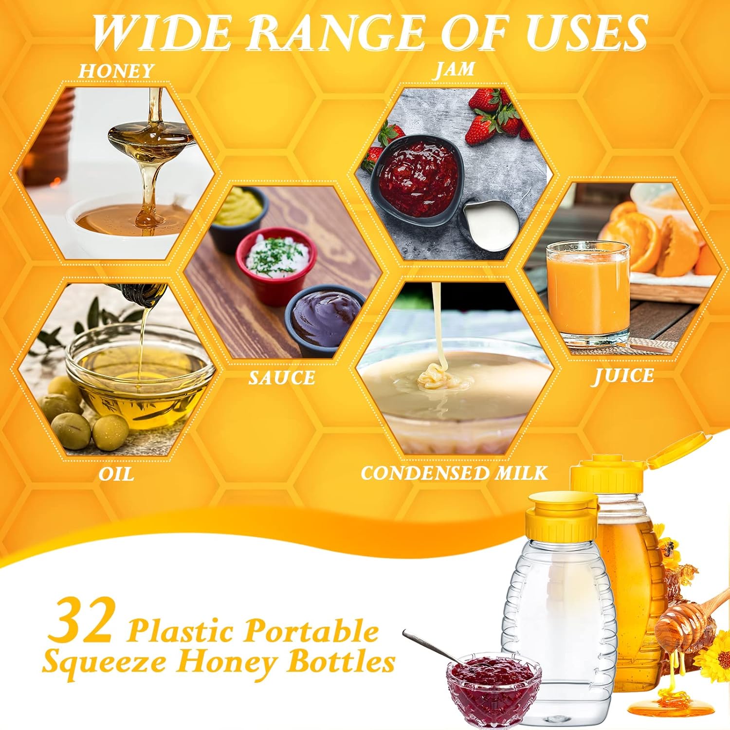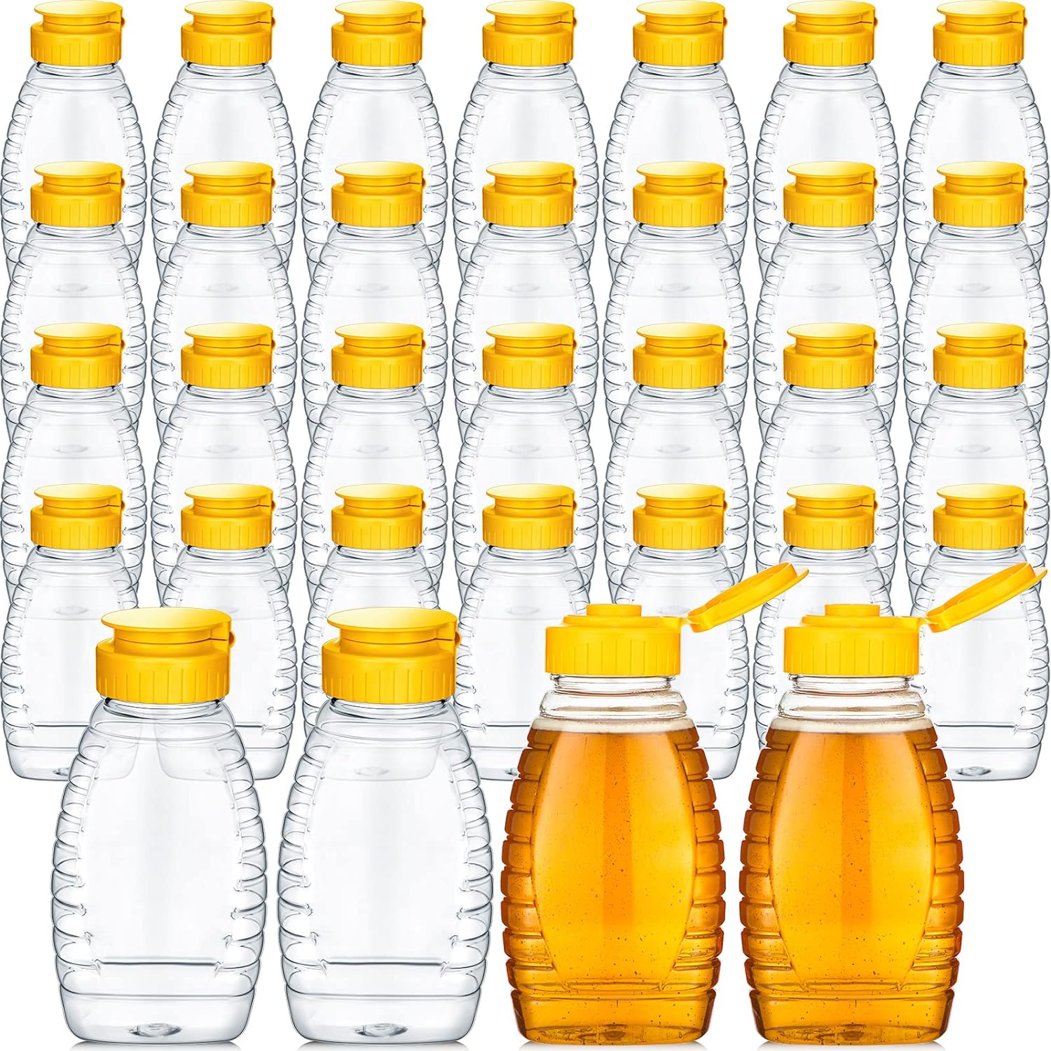 Sufficient Quantity: what you will receive are 32 pieces of honey jars with lids, designed with clear bodies and yellow caps, measuring approx. 8.8 oz, delicate and appropriate; Abundant quantities and suitable sizes can meet your daily use and replacement needs for storing and dispensing honey