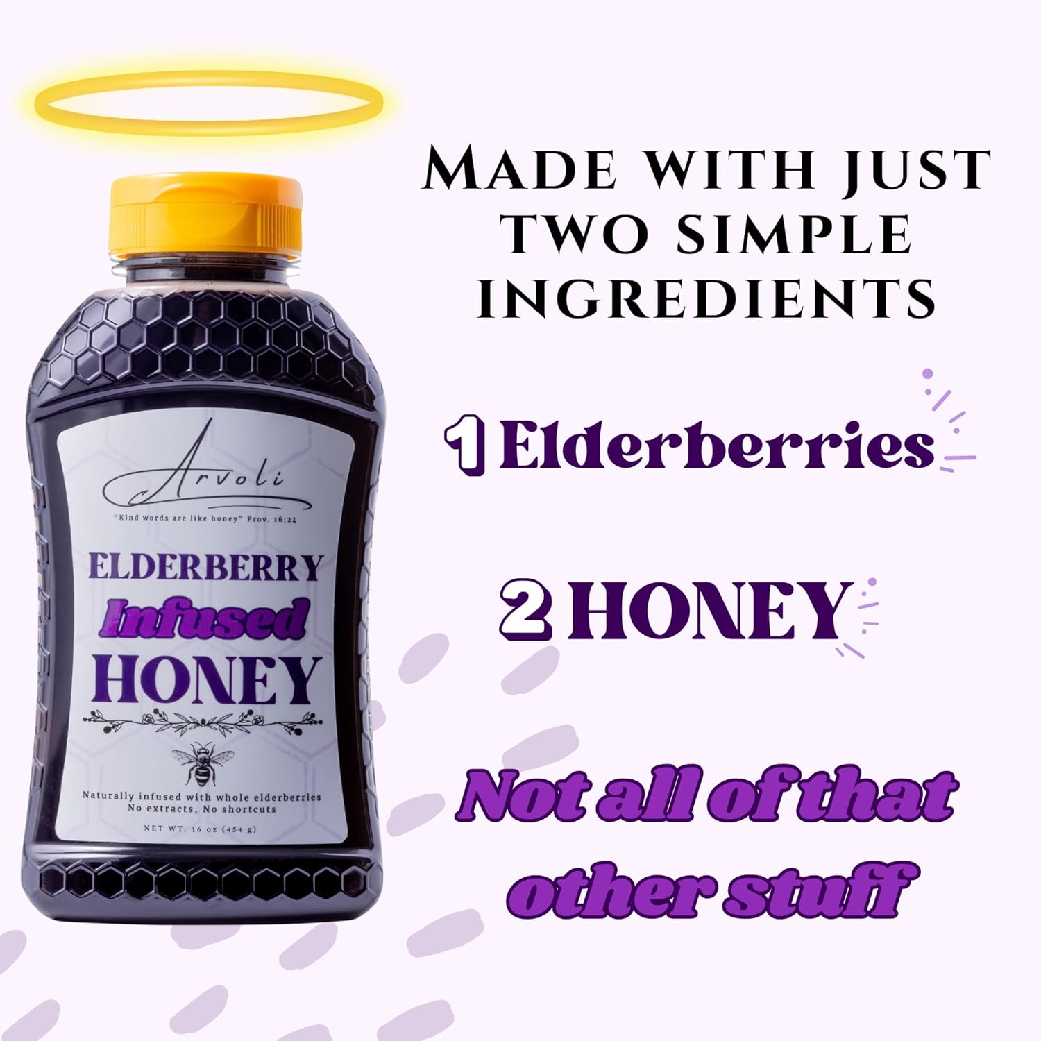 Arvoli Honey’s Premium, Raw, and ethically sourced Honey infused with whole elderberries. Two simple ingredients: Honey and Elderberries. No extracts, no concentrates, just goodness. Elderberry Honey