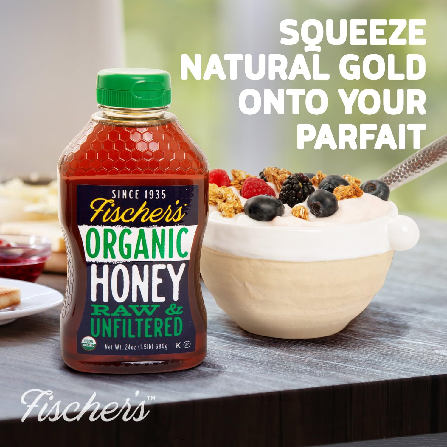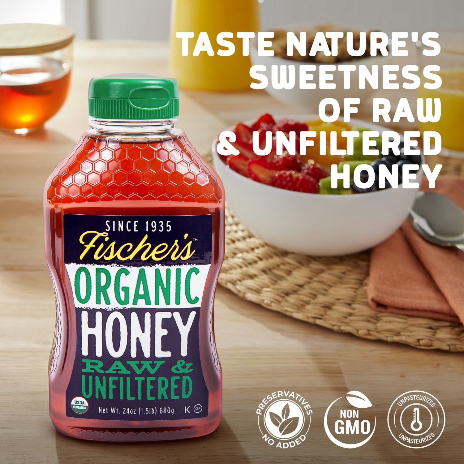 Raw Organic Unfiltered Honey — Fischer’s 100% Organic is raw, unfiltered, and unprocessed honey. We offer completely pure honey, USDA Organic Certified, with no additives, syrups, or flavors. It comes in a convenient 24 oz squeeze bottle