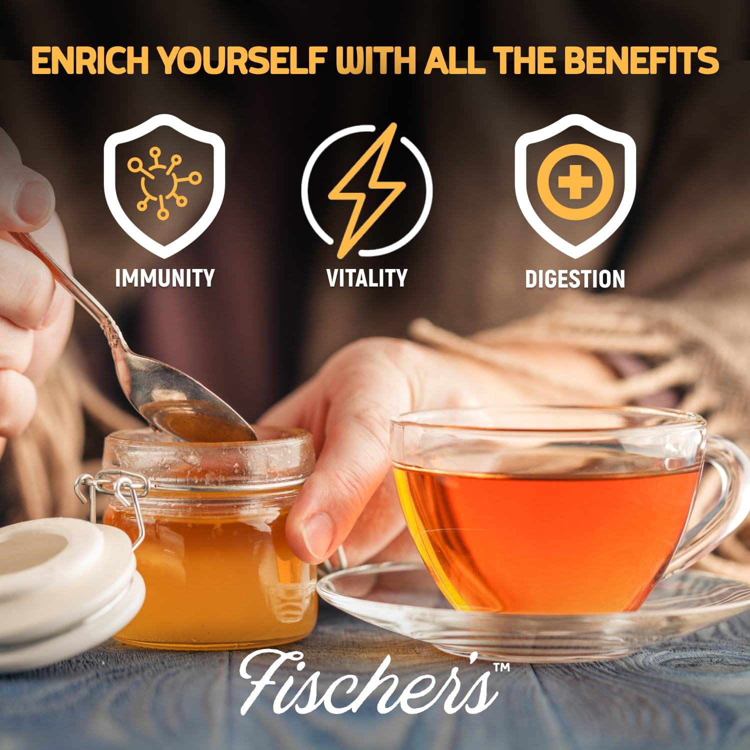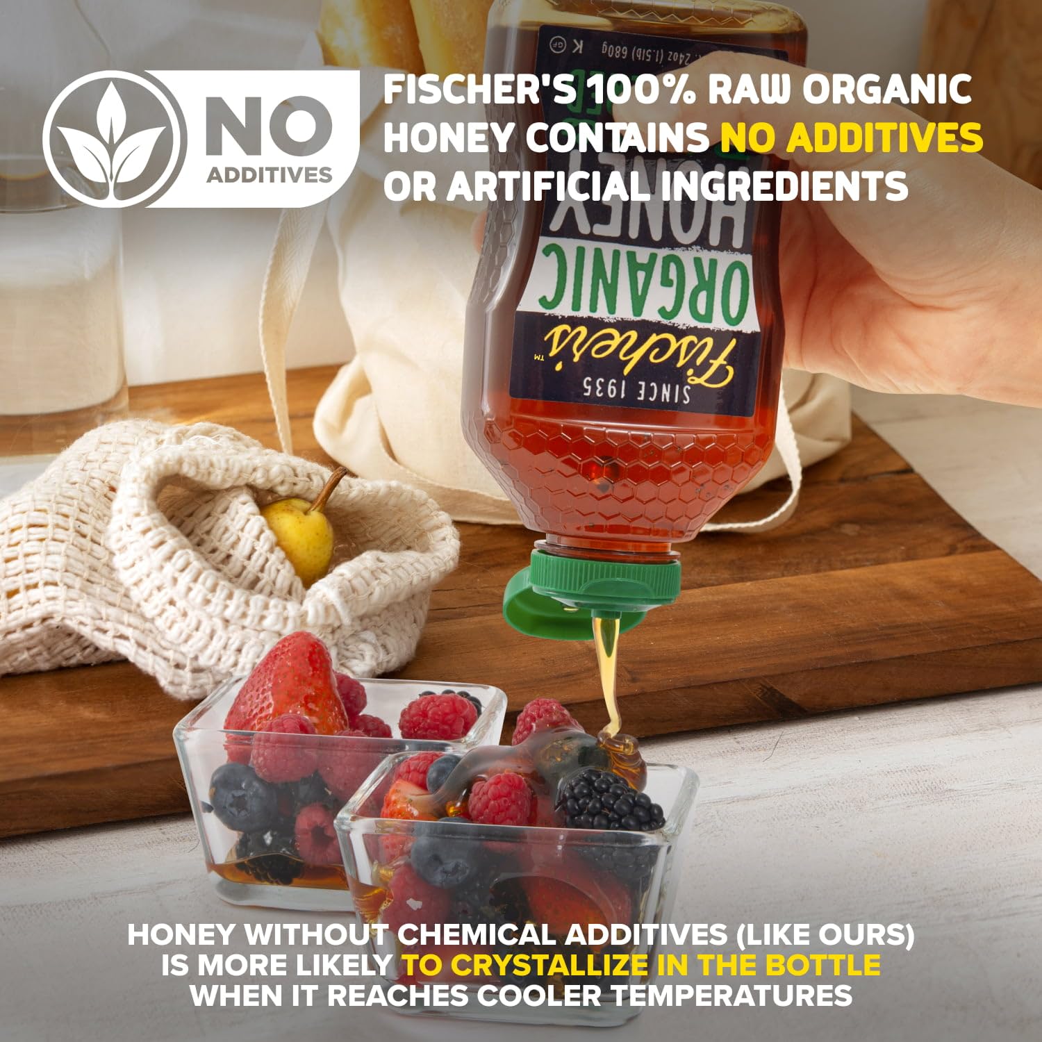 Fischer's 100% Organic Honey is made from pure, raw, and unfiltered honey sourced from natural beekeeping practices.