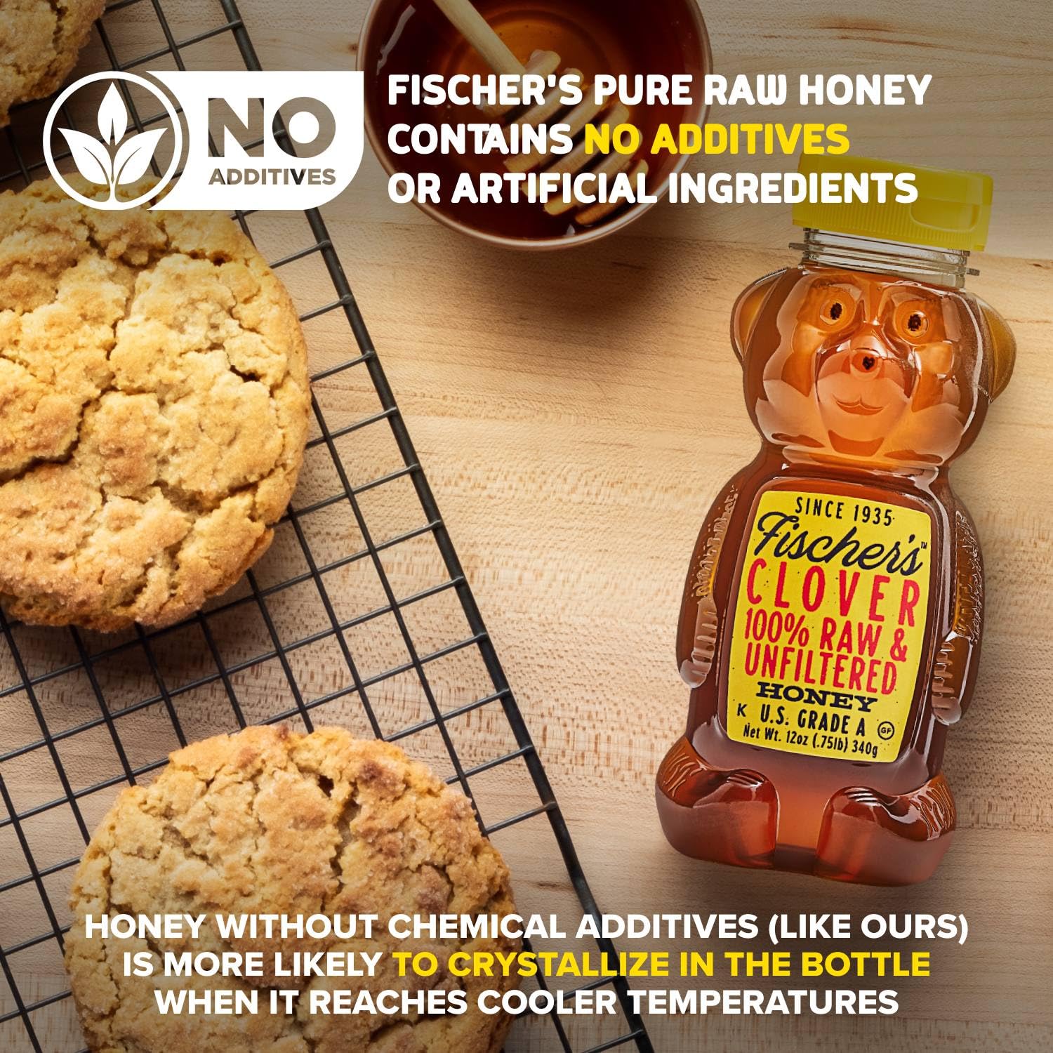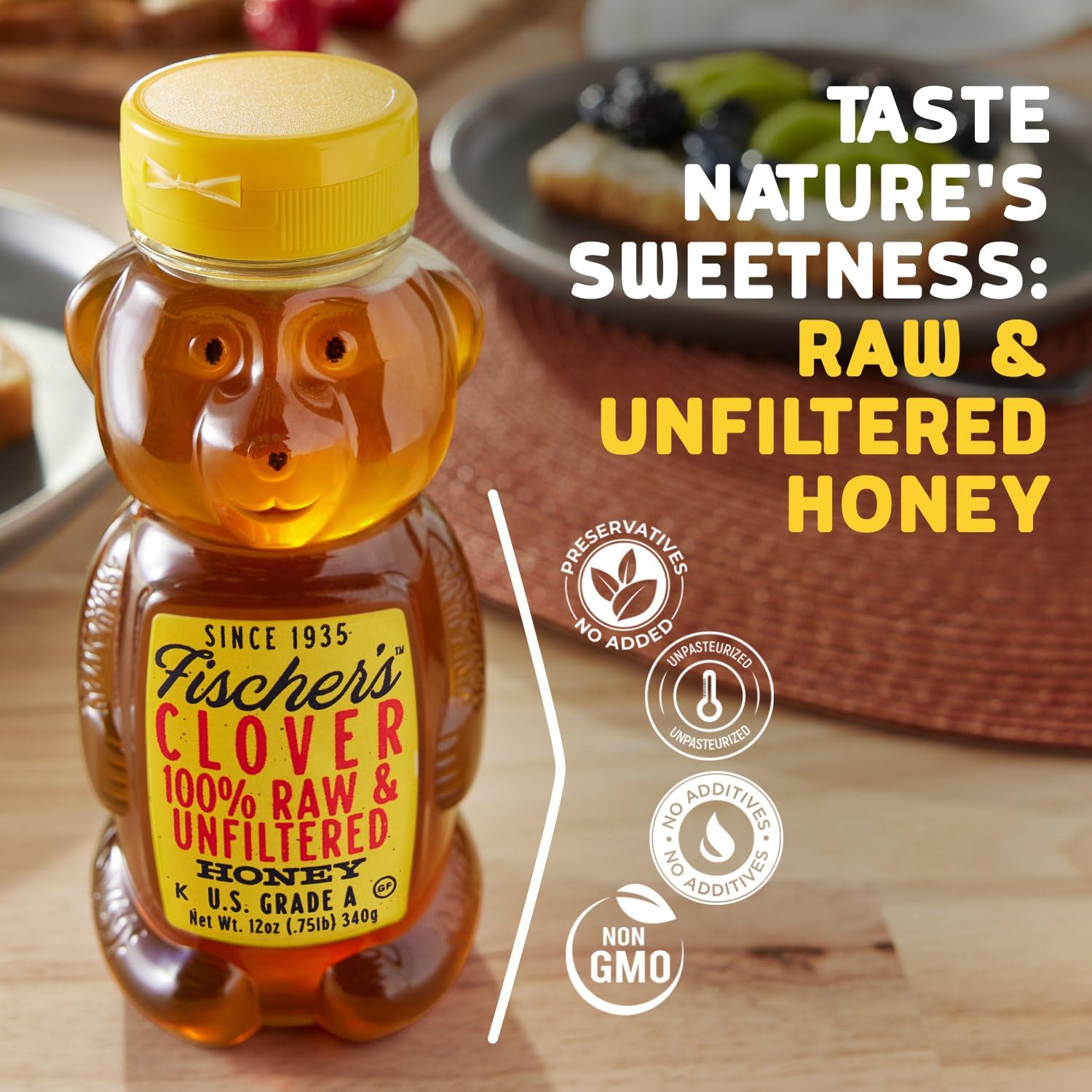 Fischer’s Clover Honey, 12 Oz – 100% Pure, Raw & Unfiltered Honey – Squeezable Bear Bottle – Gluten-Free, Non-GMO – All-Natural Sweetener
