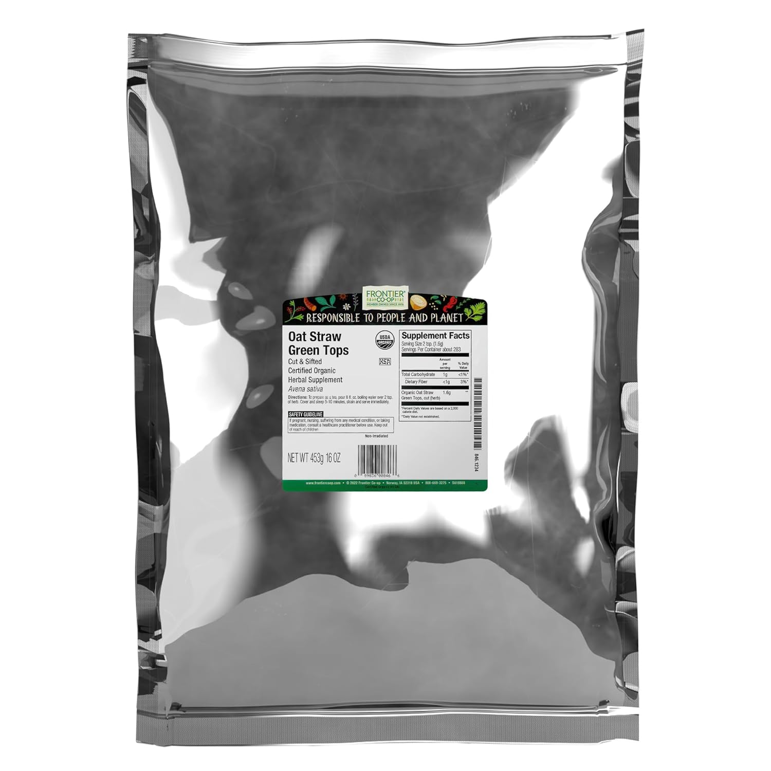 Frontier Co-op Organic Oatstraw Green Tops are grown and processed in the United States. Oatstraw is the green top of oat plants. To achieve premium quality and results, it is harvested only when its seeds mature at peak potency.