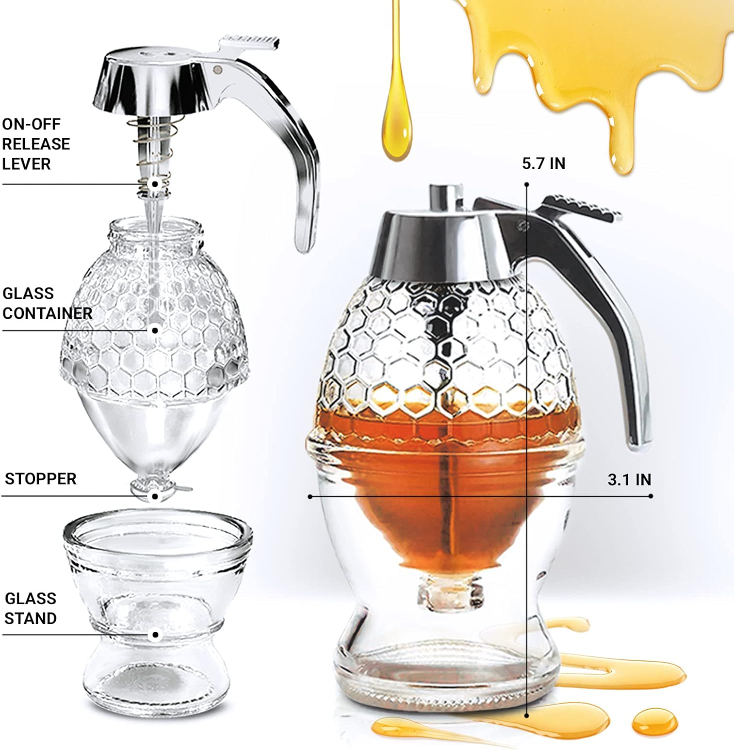 Honey Pot: The 8 Oz size of the honey dispenser is perfect for serving just the right amount of honey.Syrup Dispenser: The CLEVLI honey pot is perfect for people of all ages, including kids, teens, moms, dads, and grandparents.Honey Dispenser No Drip: The honeycomb design on our honey jars with dipper is both attractive and functional, while the included stand ensures stability and prevents tipping.