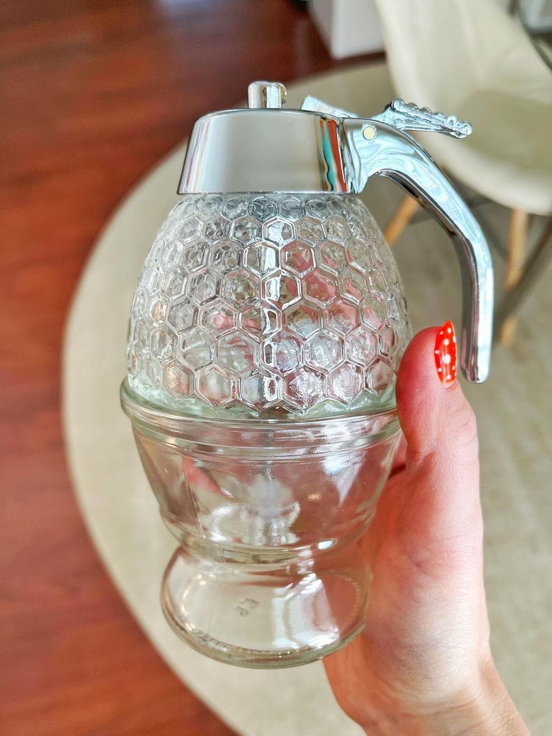 The dispenser is made of clear glass, and it has a specialized spout that prevents honey from dripping after you’ve dispensed it. As you tilt the dispenser to pour honey onto your pancakes, the no-drip feature works its magic, preventing any additional honey from dripping down the sides of the dispenser.