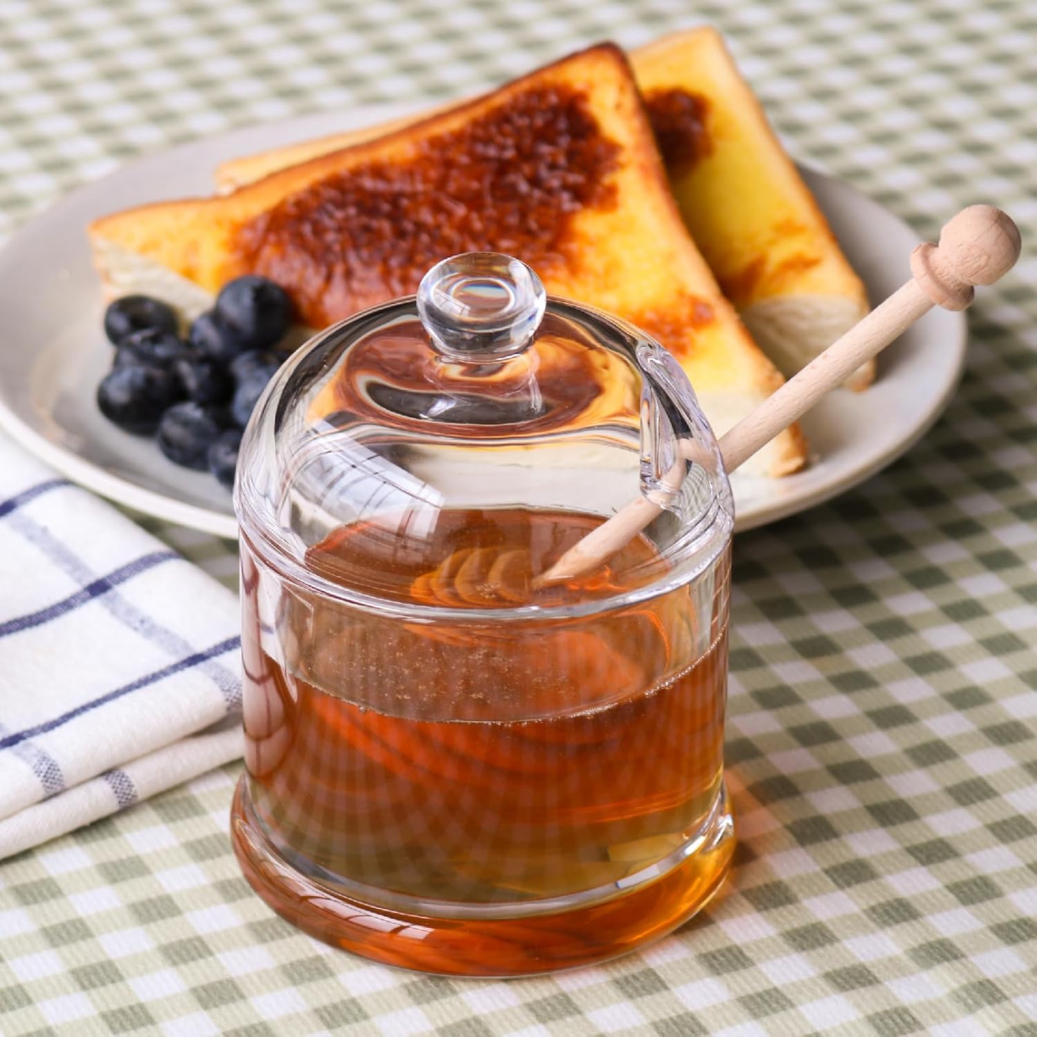 Functional: Lidded honey jar contains a dipper, convenient for tea, baking, drizzling desserts and more. It makes getting the delicious honey so much easier and without all the mess