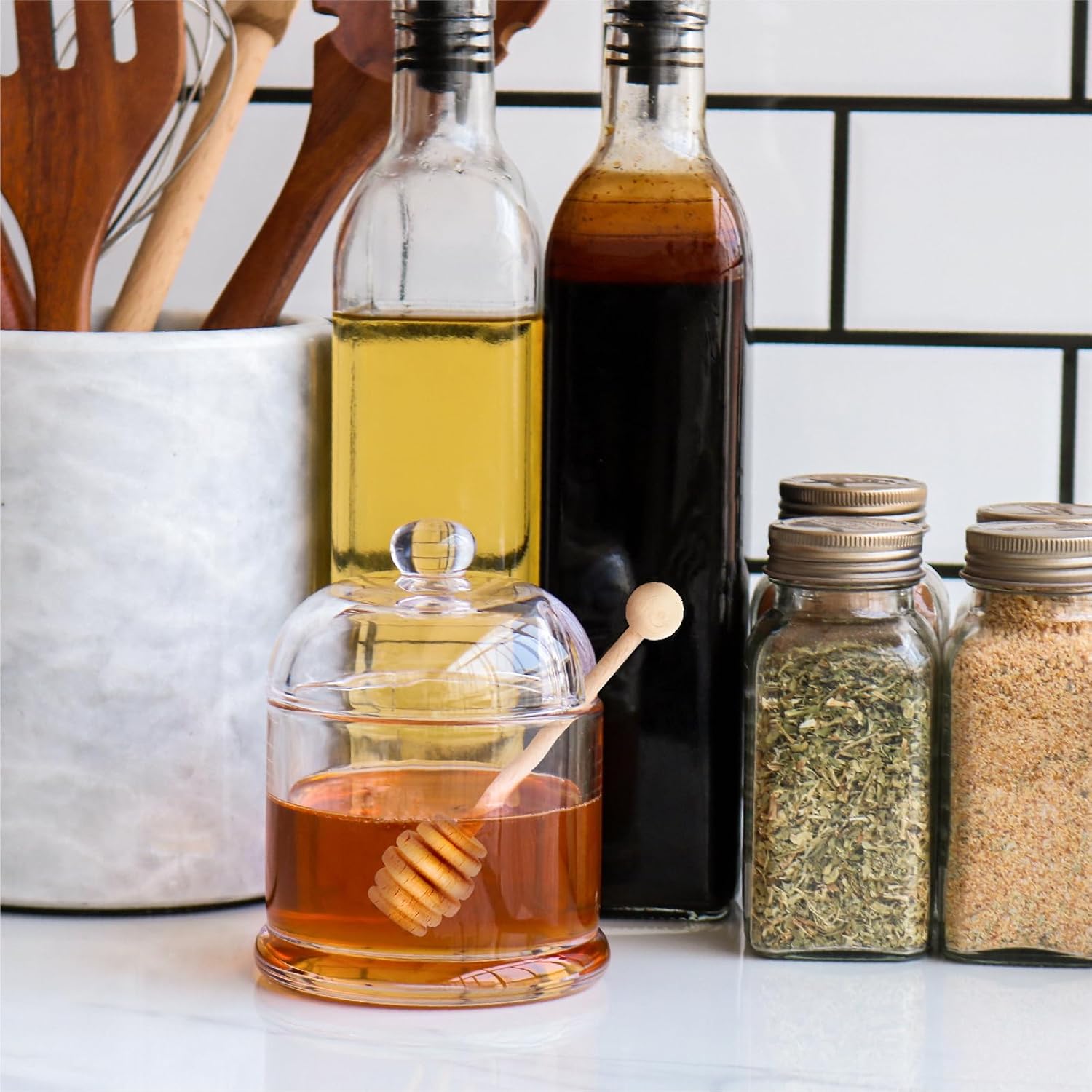 Decor: It’s very cute and a nice usable way to display your honey, adds some elegance to kitchen counter, dining table and tea bar