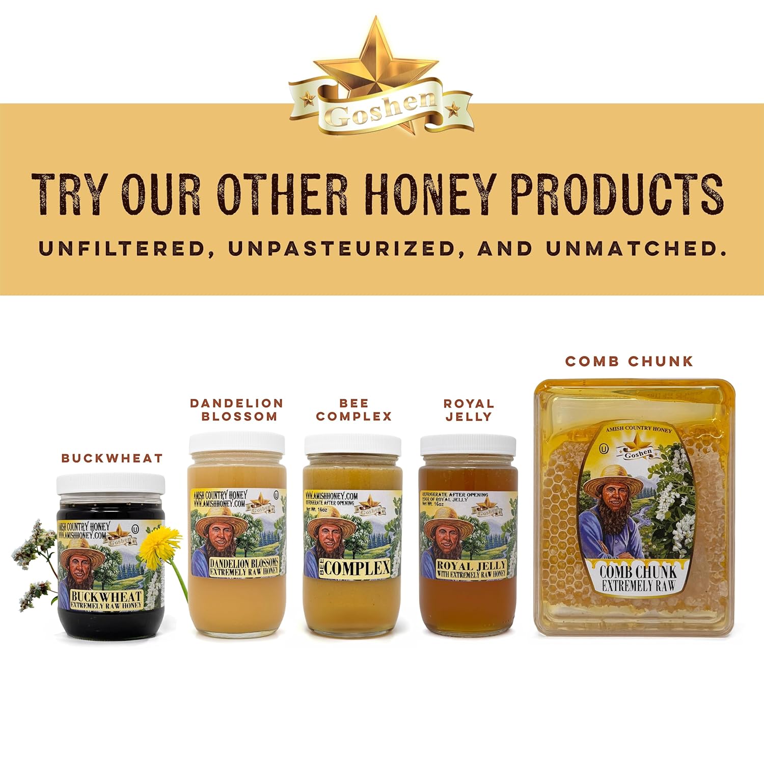 Goshen Star, Honey Comb image, and title: AUthentic Amish Country HoneyGoshen Star, Honey Comb image, and title: AUthentic Amish Country Honey