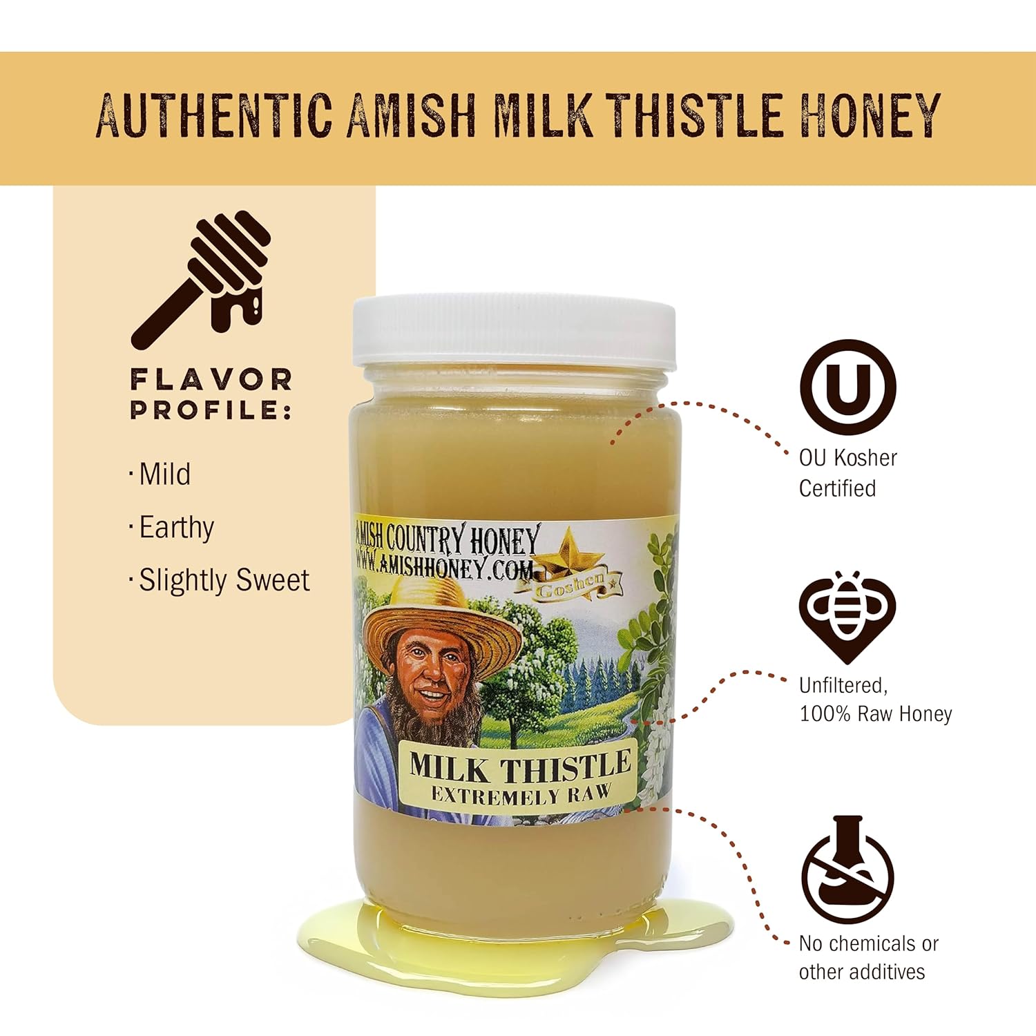 Goshen Amish Country Extremely Raw Milk Thistle Honey – Unfiltered, Unprocessed, Pure & Natural – Harvested in the USA – Rich Flavor for Tea, Cooking, Wellbeing – Kosher Certified – 16oz Glass Jar