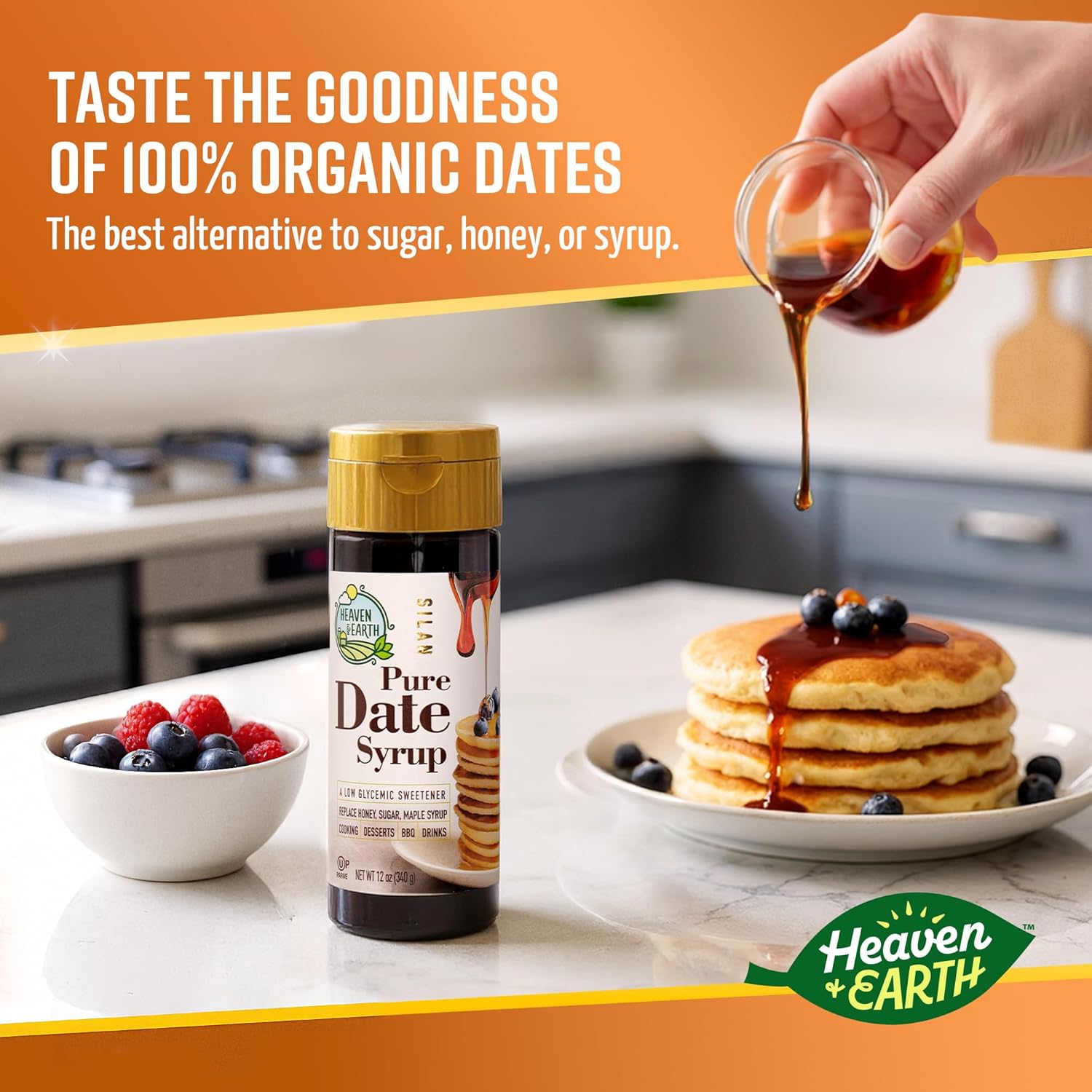 PURE SWEETNESS – Heaven & Earth Date Syrup is a naturally sweet, delicious & rich replacement for honeys, sugars and other syrups.