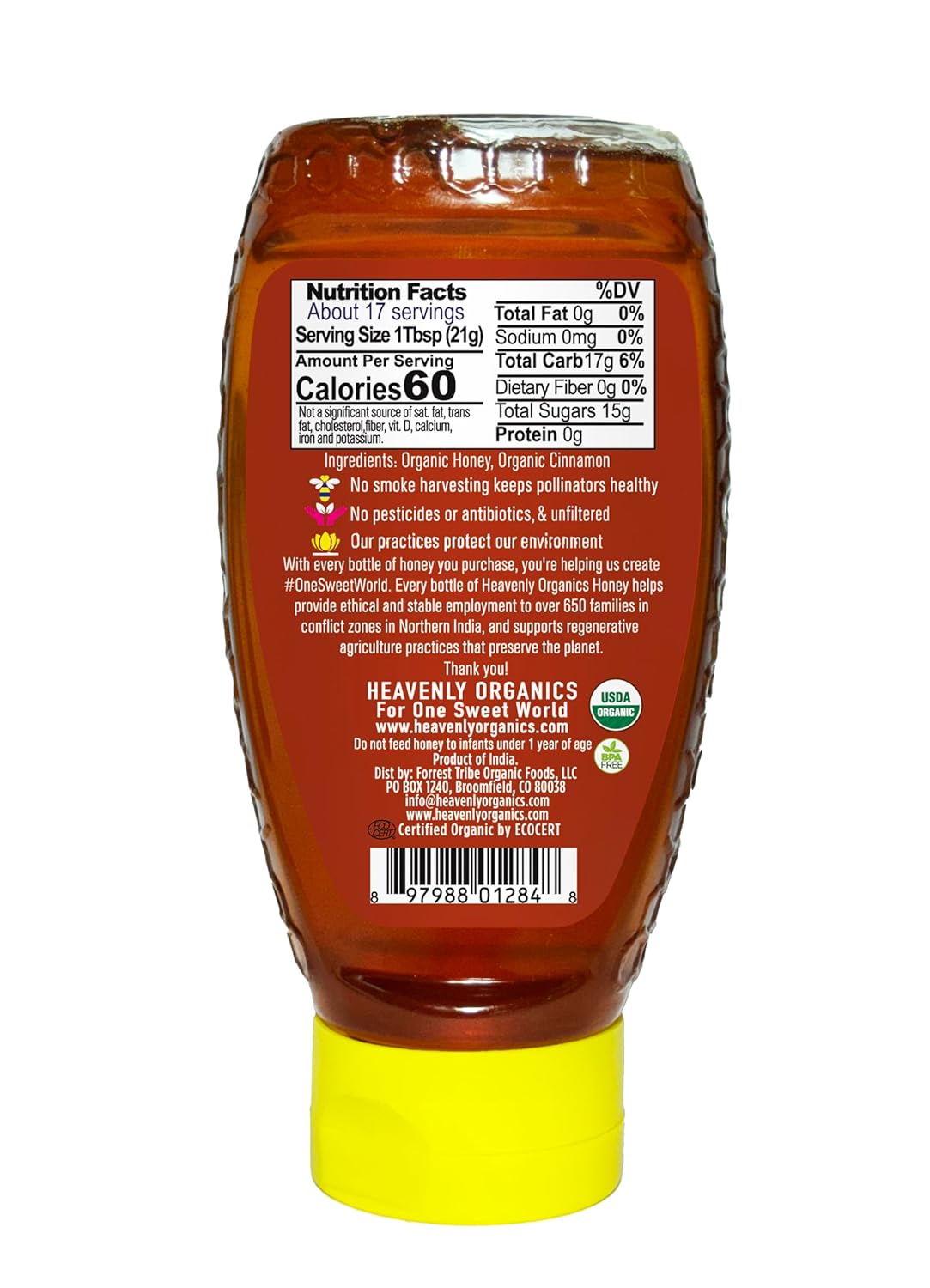 Heavenly Organics 100% Organic Hot Honey Infused with real Cinnamon Heavenly Organics 100% Organic Raw Honey -This honey originates from bees pollinating the blooming Wild flowers in the pristine forests India. These wild beehives are located in the secluded valleys of the Jammu region of the Himalayan Mountains. This , robust and rare honey is perfect for anything you use honey for like drizzling on warm cereals and pancakes. Also makes a wonderful baste for fish and meat. This Honey is prized for its delicate fruity taste and mild tangy finish. This rare honey is perfect for anything you use honey for like drizzling on fruit and yogurt and in herbal and green teas. 100% USDA Certified Organic Non-GMO Project Verified Antibiotic & Pesticide Free Fair Trade Certified OU Kosher Certified Gluten, Dairy & Nut Free Sustainably Harvested Raw Wild Collected & Bee Friendly At Heavenly Organics, they believe that goodness comes in many forms and life is sweeter when in balance. That’s why they travel to isolated valleys and pristine forests to bring you products made from the purest, organic ingredients on earth. They are dedicated to preserving the livelihoods of family and farmers in remote and conflict areas, as they believe that profits can create peace and ancient ways can deliver delicate goodness to today’s modern world. Heavenly Organics organic delights will enlighten your spirit through health, harmony and deliciousness. Heavenly Organics. For one sweet world. What makes Heavenly Organics honey so special? Wild & Free: Their bees live outside of the box in naturally occurring, wild beehives. Sustainably Sourced: Heavenly Organics uses bee-friendly and smoke-free methods that protect wild bee colonies & eliminate the potential for forest fire