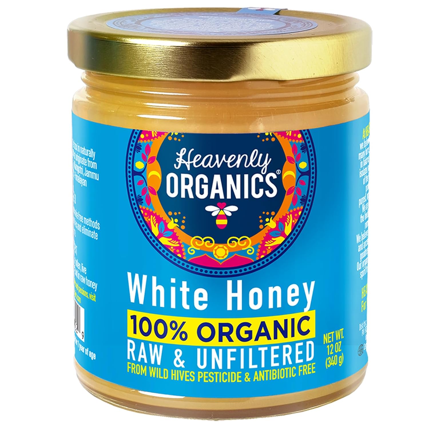 Heavenly Organics 100% Organic Raw White Honey is a lightly filtered honey sourced from wild beehives and free-range bees, produced by a cooperative of organic farms in the Himalayan foothills and Northern and Central India.