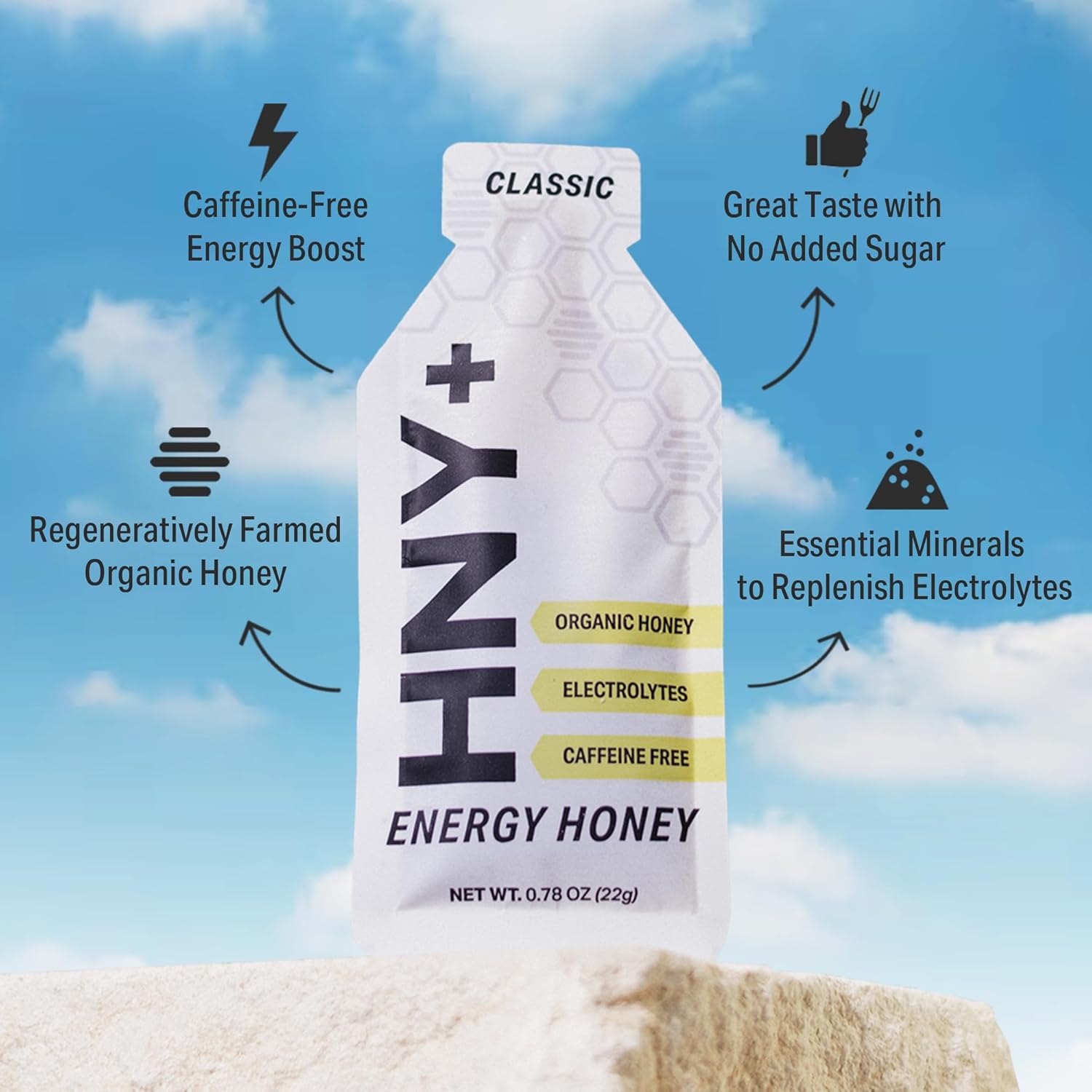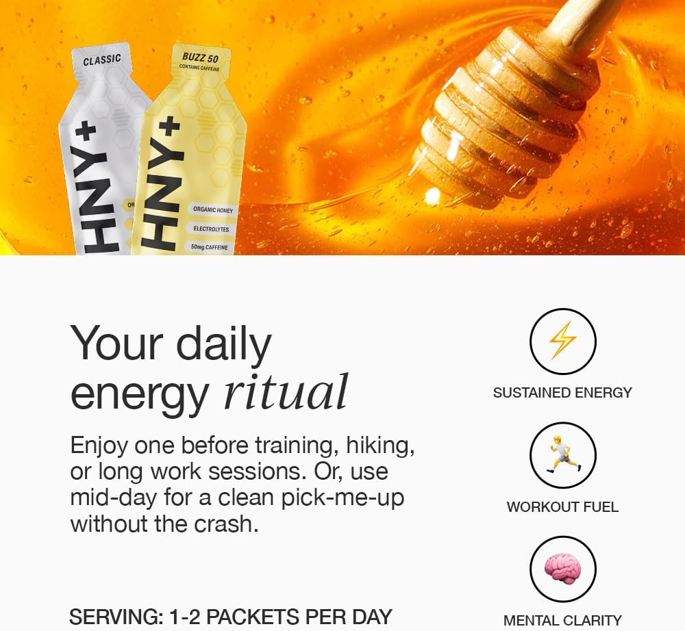 EXPLORE BOTH ENERGY ESSENTIALS: Experience the classic formula for pure organic honey energy during long runs and endurance activities, or try the HNY+ Buzz version with green tea caffeine, delivering 50 mg of caffeine for extra focus during exercise.