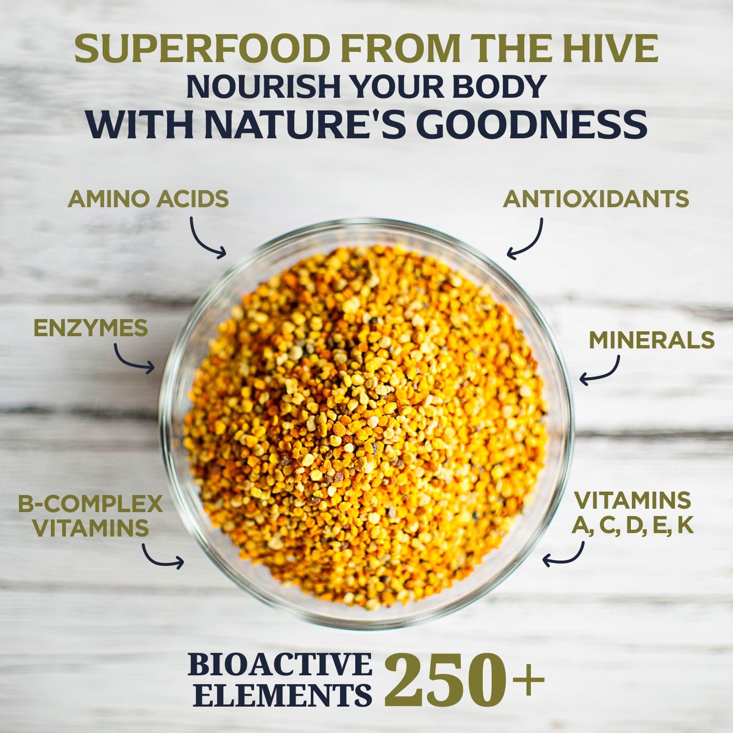 100% PURE ORGANIC AND RAW BEE POLLEN – Our raw bee pollen is carefully harvested from flowers and naturally dried to preserve all of its beneficial properties. No additives, preservatives, or artificial flavors – just pure organic bee pollen at its best.