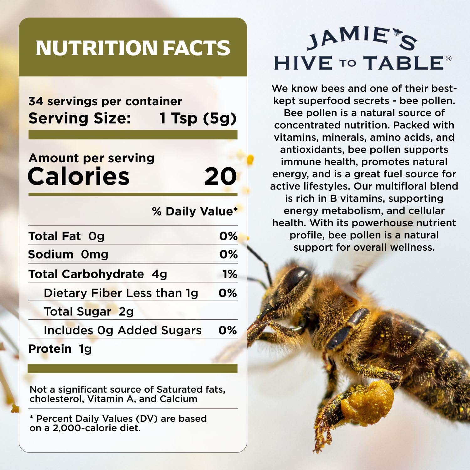 Jamie’s Hive to Table Organic Bee Pollen, 6 oz – 100% Pure, Raw & Natural Superfood, Premium Quality Bee Pollen Granules for Energy, Immunity, Skin Health, Antioxidants, & Vitality, Gluten Free