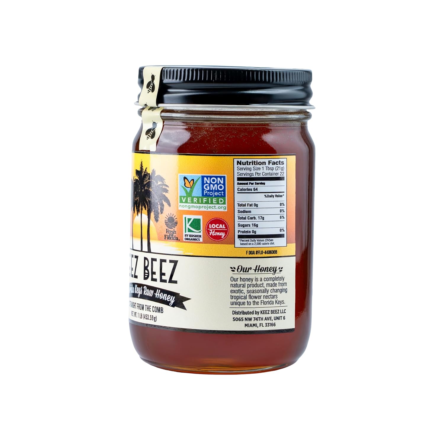 The KEEZ BEEZ Wildflower Honey comes in a 16 fl oz (1 lb) glass jar.
