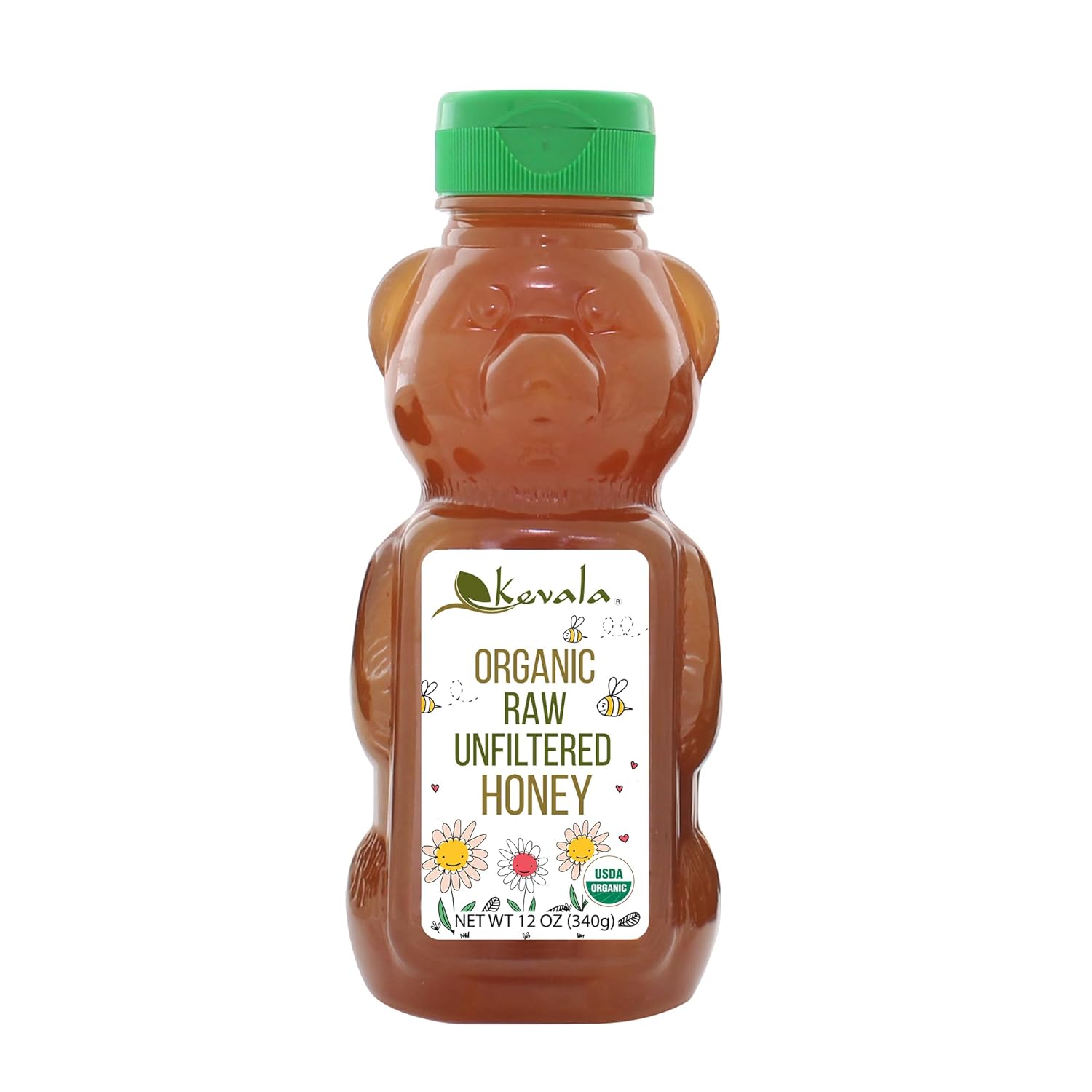 Kevala Organic Raw Unfiltered Honey Bear – Gluten Free Sweetener with No Sugar Added, Deliciously Sweet and Nutritious Addition to Pancakes and Waffles, Squeezable Bottle for Easy Use, 12 oz