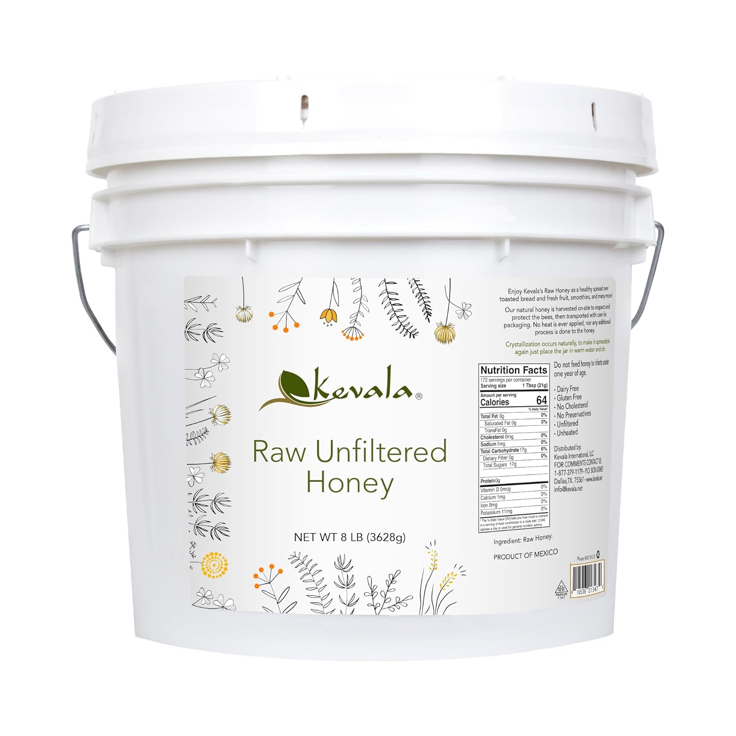 Kevala Raw Unfiltered Honey – Unprocessed Liquid Sweetener Harvested Without Pesticides, Bee-Friendly Harvesting On-Site, Sweet Spread for Toasted Bread and Desserts, Maple Syrup Substitute, 8 lb Pail