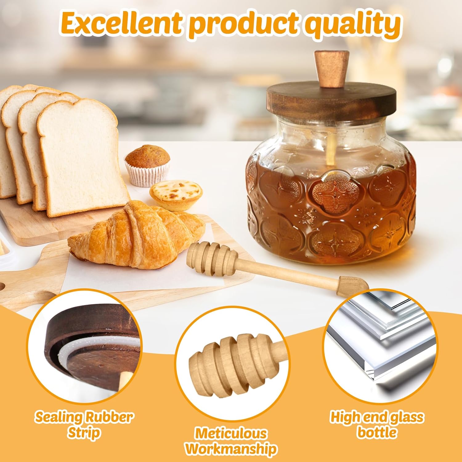 Made of Durable, Thickened Glass & Natural Wood Lid – Crafted from high-quality, lead-free thick glass that resists odor and staining. Paired with a tight-sealing wooden lid to keep your honey fresh, pure, and prevent crystallization.