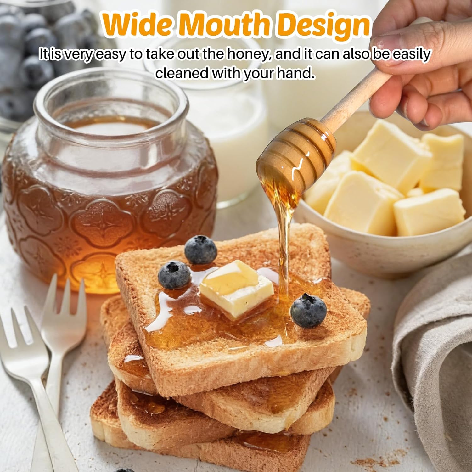 Includes Oversized Honey Dipper a Spare Stick – Comes with a long, ergonomic honey dipper that fits the wide mouth perfectly for easy drizzling and minimal dripping. We include an EXTRA honey stick, so you always have a backup, ensuring you’re never without the perfect tool.