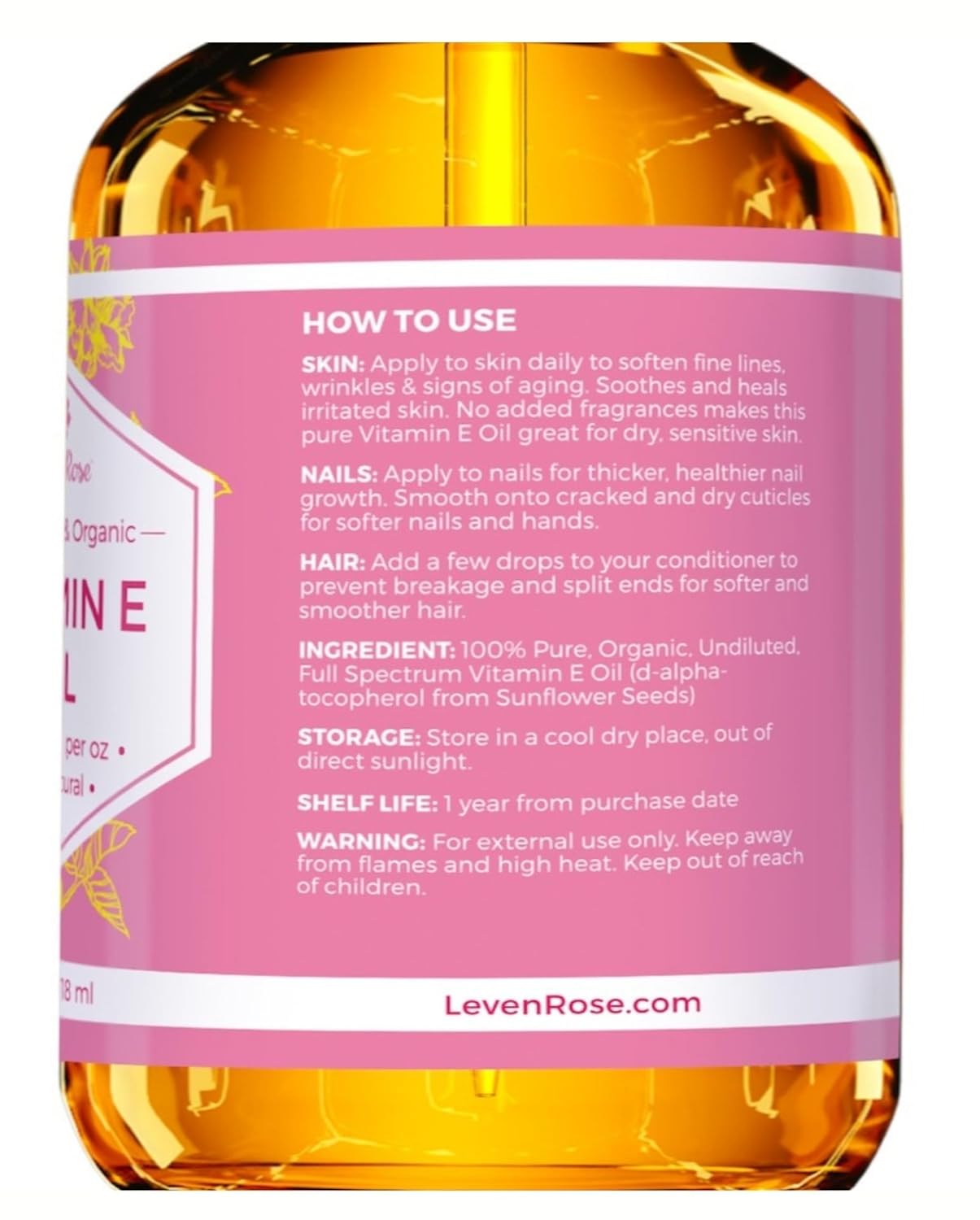 The world of beauty and wellness with our 4 oz Leven Rose vitamin E oil. Beautiful and resistant skin and lush hair and nails are closer than it might appear. Imagine a skincare routine that feels like an amusing spa day, every day. This vitamin E oil hydrates and nourishes, leaving your skin with a healthy glow. Its silky texture feels like a gentle touch, and the earthy scent adds a touch of nature to your daily makeup. But the magic doesn’t stop there. Our vitamin E oil can be used for many purposes. It’s not just for your skin – it’s for your hair too. It makes the dry, brittle hair lively and filled with energy in every strand. Furthermore, it doesn’t forget about your nails, repairing cracks and dry cuticles. Protect your skin from the rough elements with fun by using our vitamin E oil. Whether it is the strong winter cold or the summer sun, this oil has got your back. Its antioxidant properties shield you from many things. Convenient vitamin E oil with a user-friendly pipette takes only a few actions and no effort to apply oil. Achieve Instant and long-lasting results are that are a drop away from you.