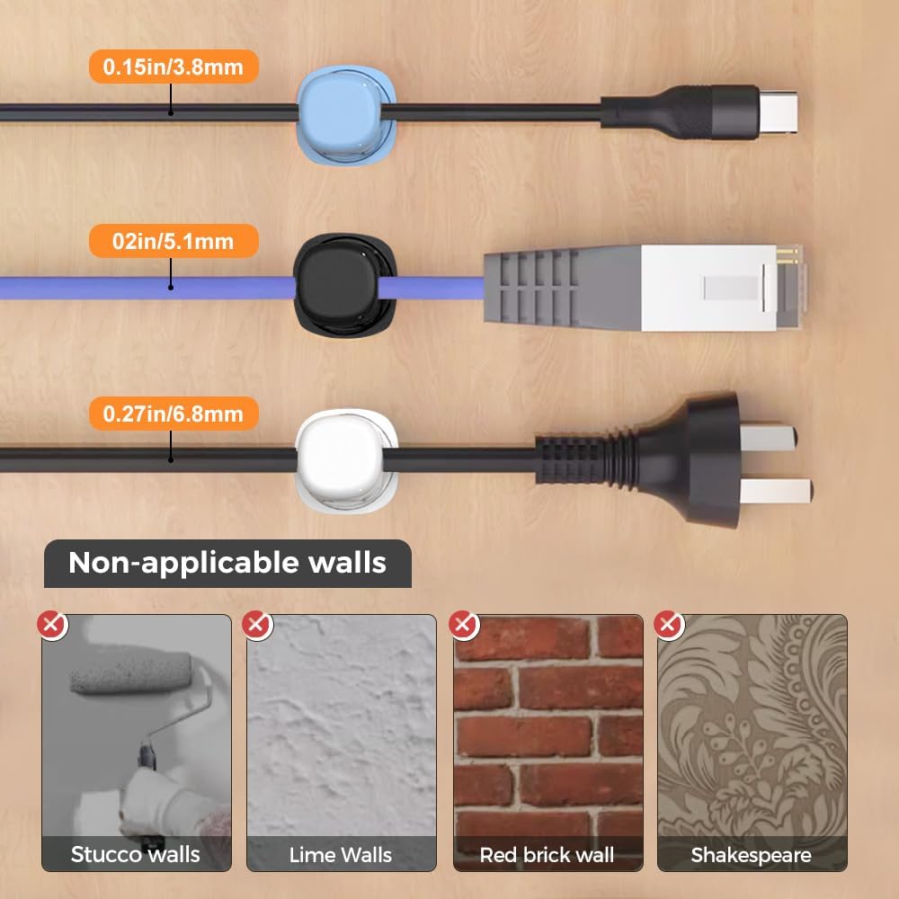 These clips can be used on desks, walls, nightstands, and under desks for effective cable management.