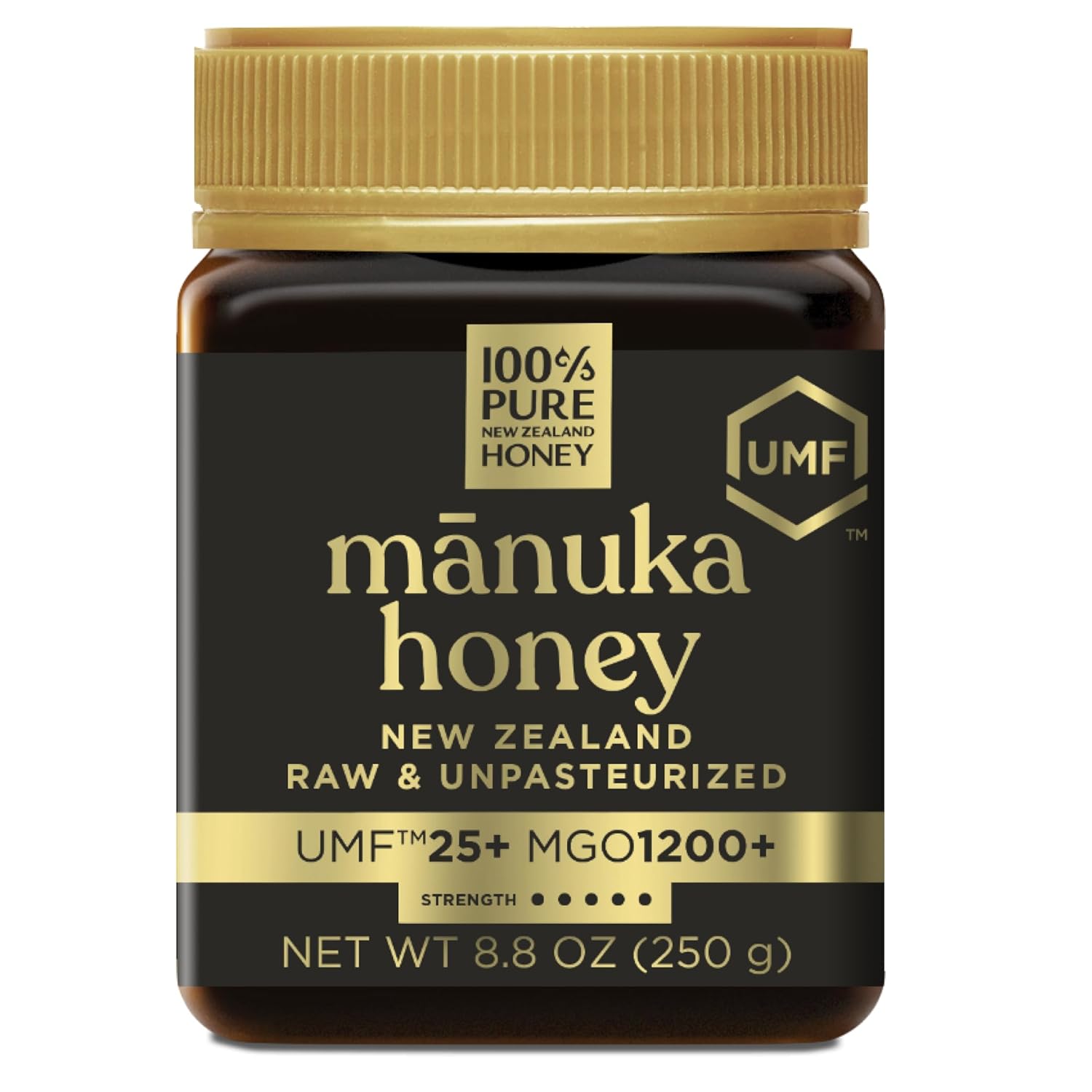 EMBRACE SUPREME VITALITY with UMF 25+ Mānuka Honey. A very rare form of genuine mānuka honey, with guaranteed monofloral with levels of MGO at least 1200 mg/kg methylglyoxal. This pure mānuka honey is very dark in color, with a stronger taste and thicker texture. UMF 25+ is the gold standard for those that seek the rarest in mānuka honey.