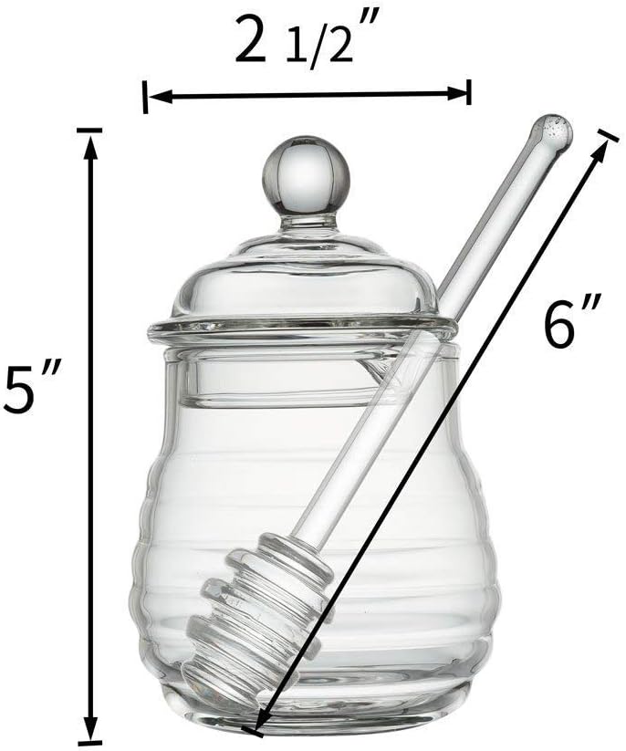 Material:Handcrafted clear glassSize: Total high-5″ ,Diameter -2.5″ Package: Honey Jar with Lid x 1; Dipper x 1