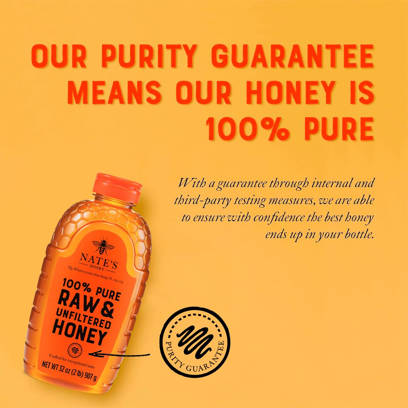 PURITY GUARANTEE: Every bottle of Nate’s most-trusted honey has a purity guarantee to uphold strict testing standards that provide an unmatched level of care and precision that would make any honeybee proud.