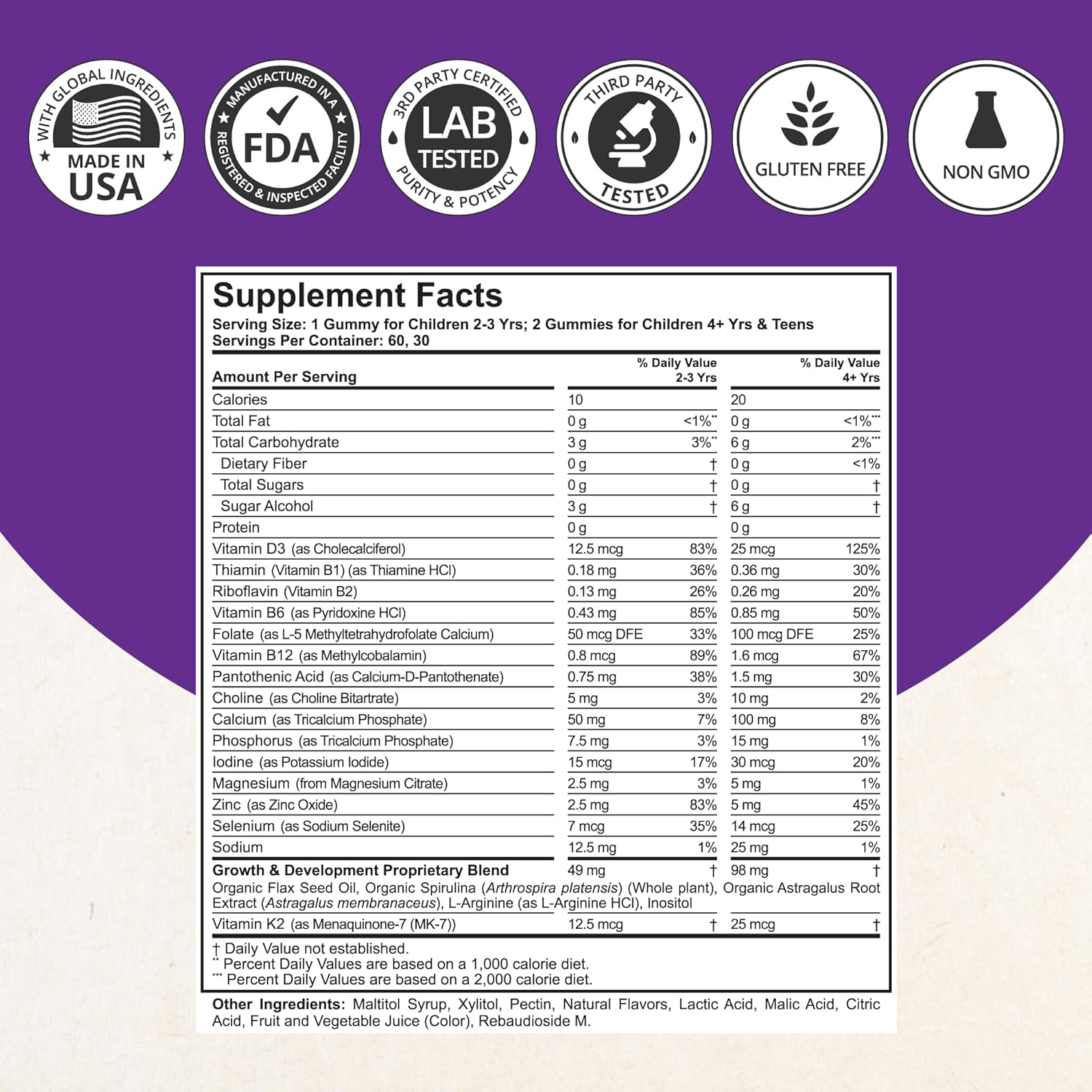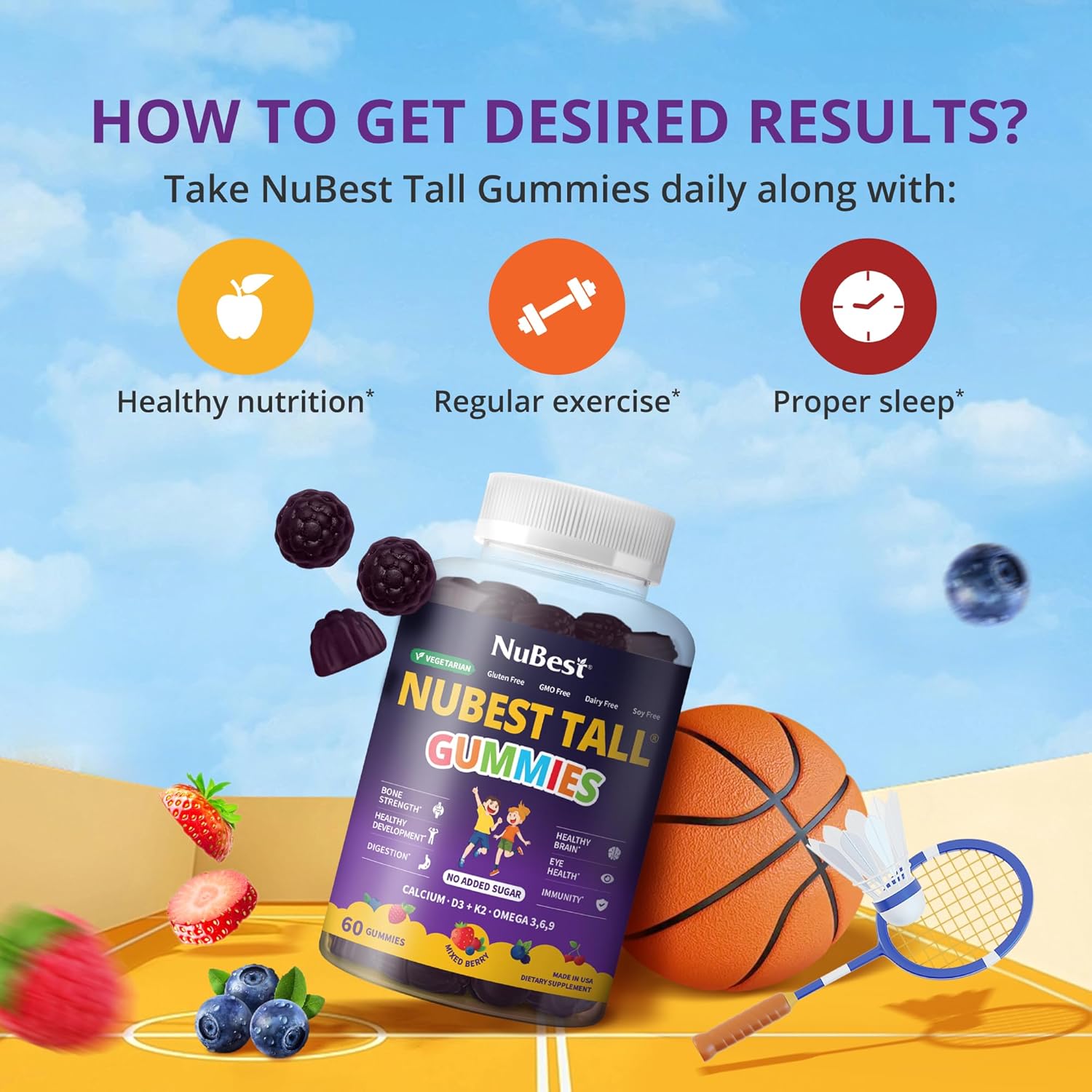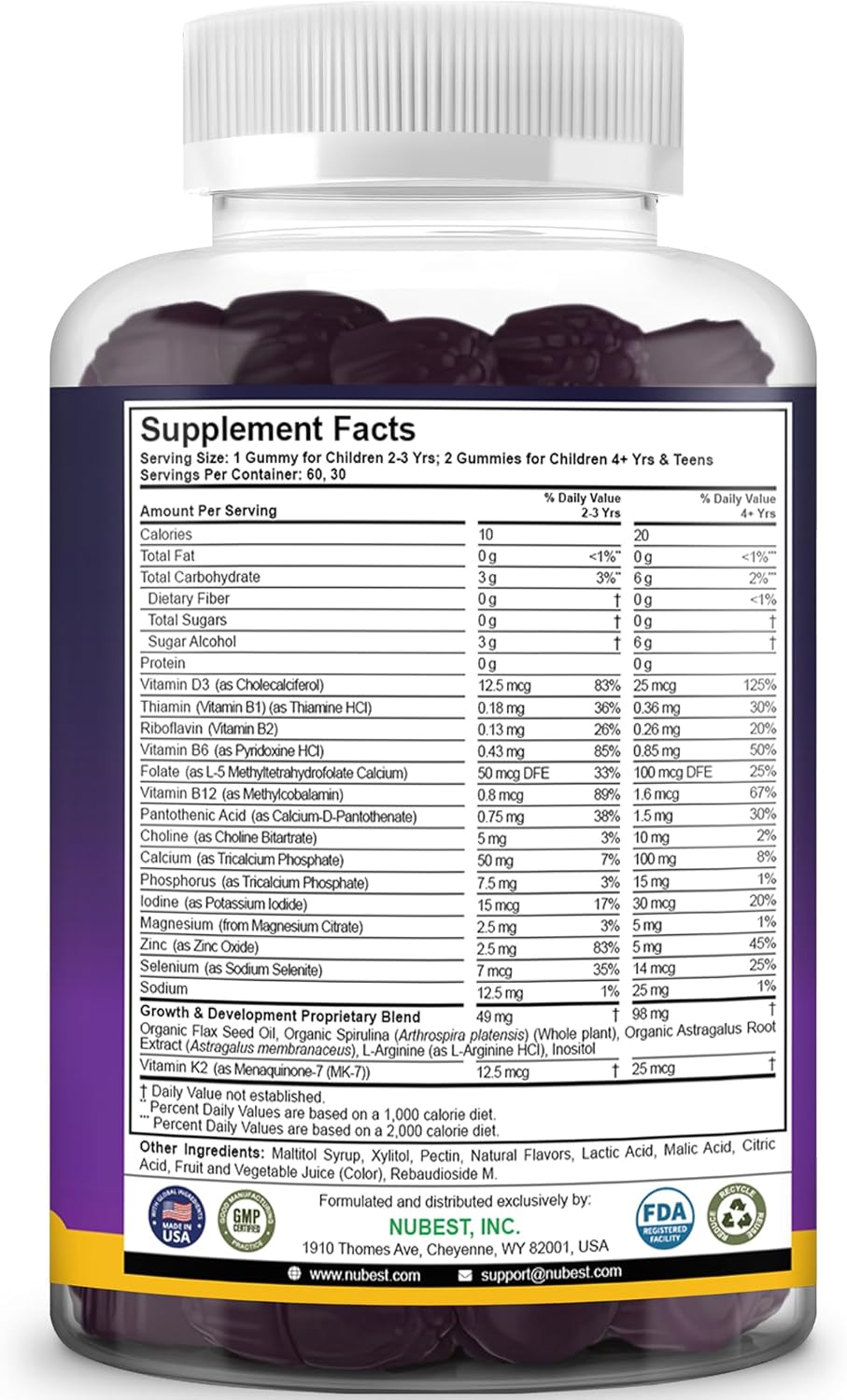 CHOOSE HEALTHY, CHOOSE NUBEST TALL: Our kid’s multivitamin gummies are free of GMO, gluten, and soy, pectin-based, vegan, and made in the USA in an FDA-registered and GMP-certified facility.