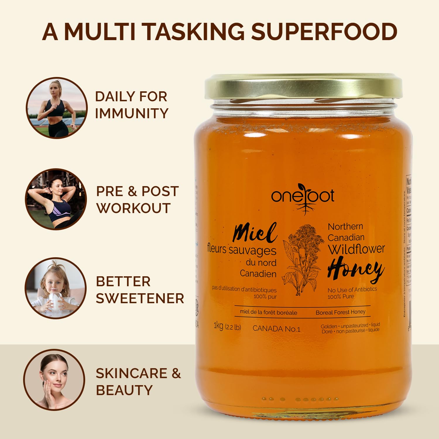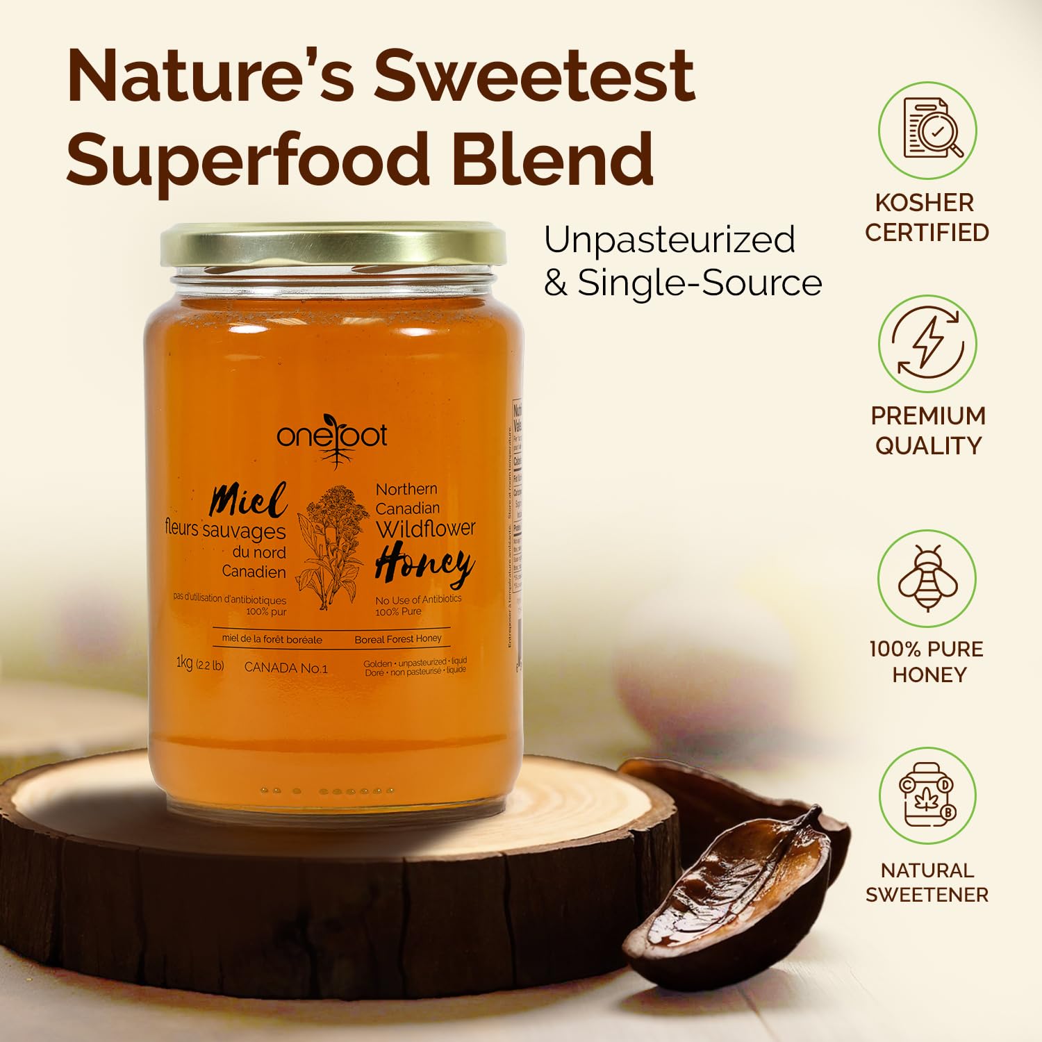 OneRoot Natural Wildflower Honey – 2.2 lbs / 1kg, Pure Canadian Boreal Forest Honey – Unpasteurized, Minimally Filtered & Single-Source – Rich in Enzymes & Antioxidants